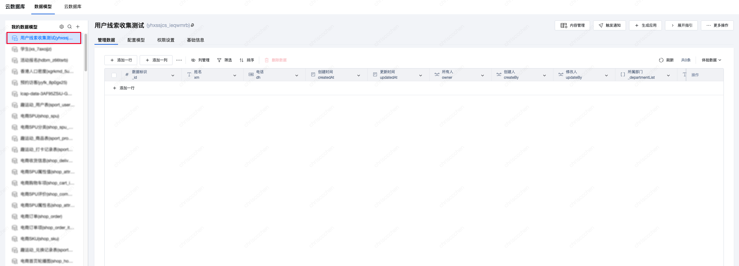 2. 单击云数据库,在数据模型中找到刚才创建的模型,即可对提交的数据进行查看和管理。