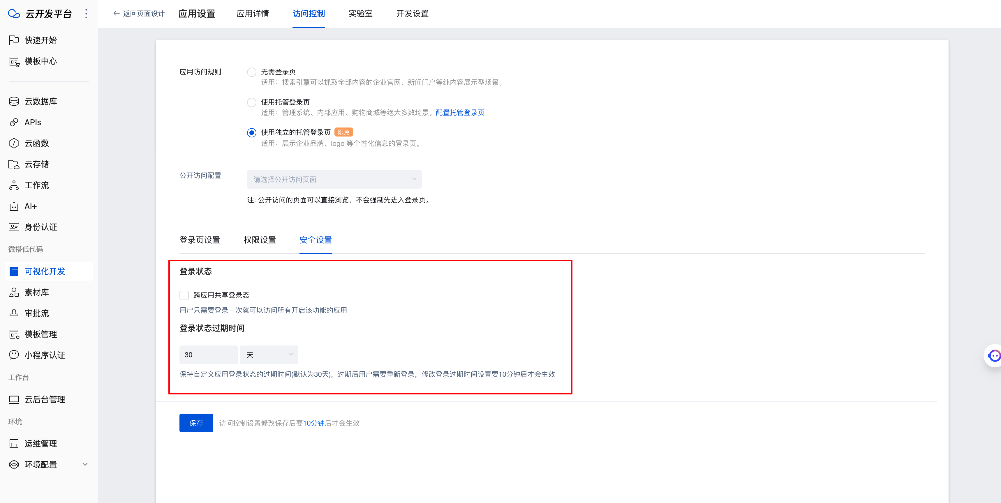 保持自定义应用登录状态的过期时间(默认为30天),过期后用户需要重新登录,修改登录过期时间设置要10分钟后才会生效。