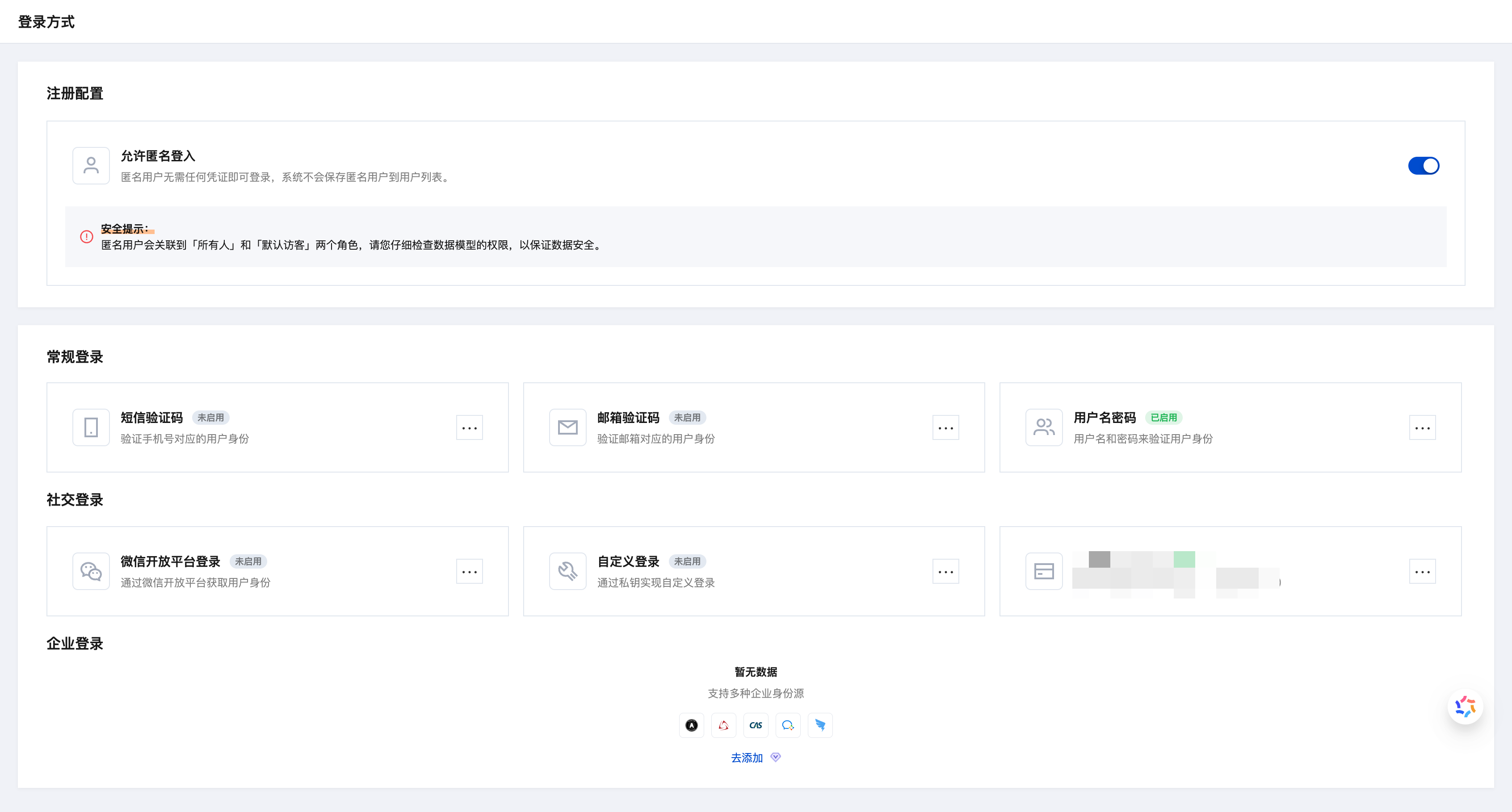 CloudBase 提供多种身份认证方式,在使用前需要先开启所需的登录方式。您可以通过控制台或 SDK 两种方式来管理登录方式的开启和关闭。