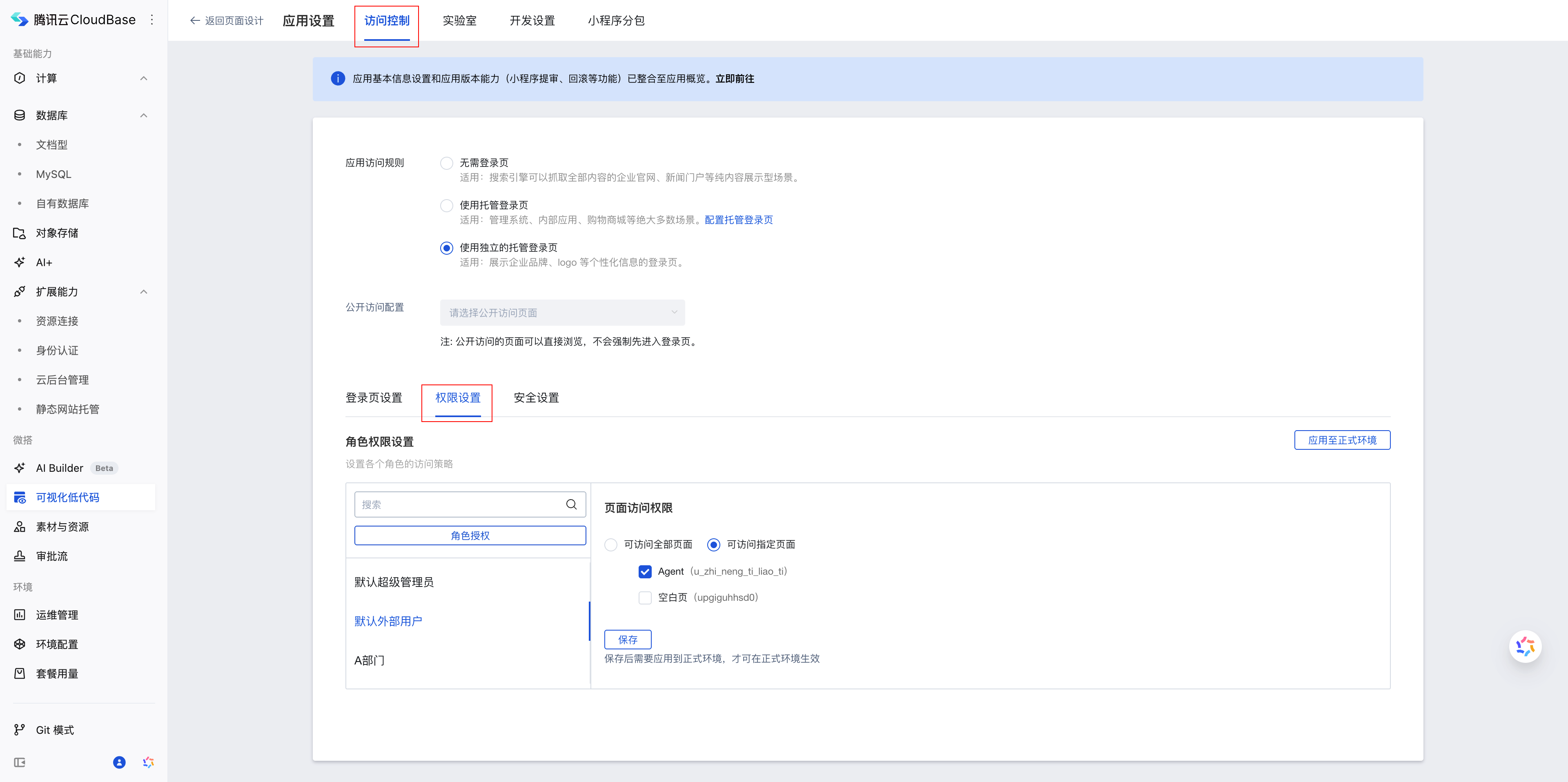 当「应用访问规则」选择「使用独立的托管登录页」时,可以配置页面权限