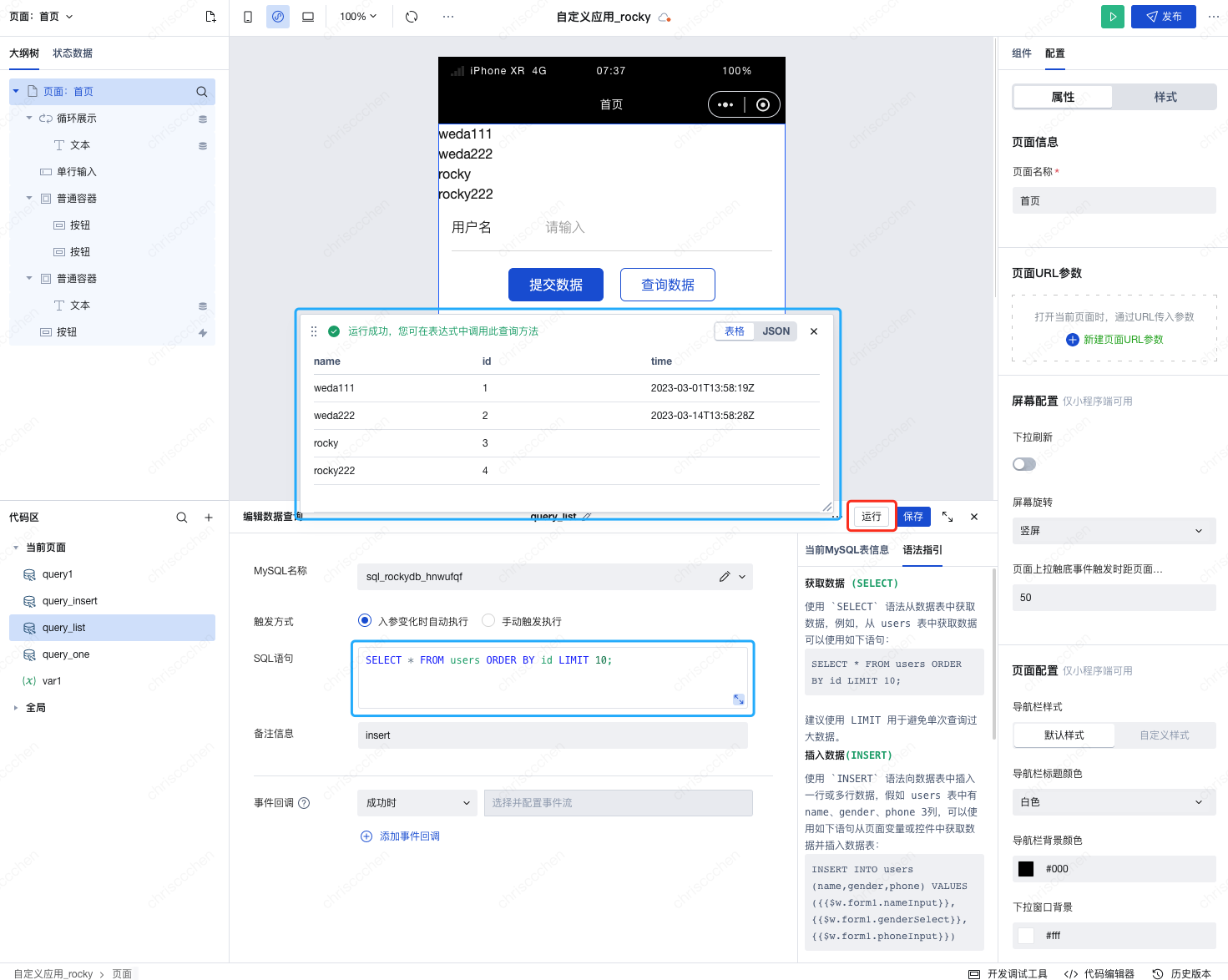 5. 分别完成上图所述的数据绑定后,一个简单的从外部 MySQL 获取的用户列表数据渲染就完成了。