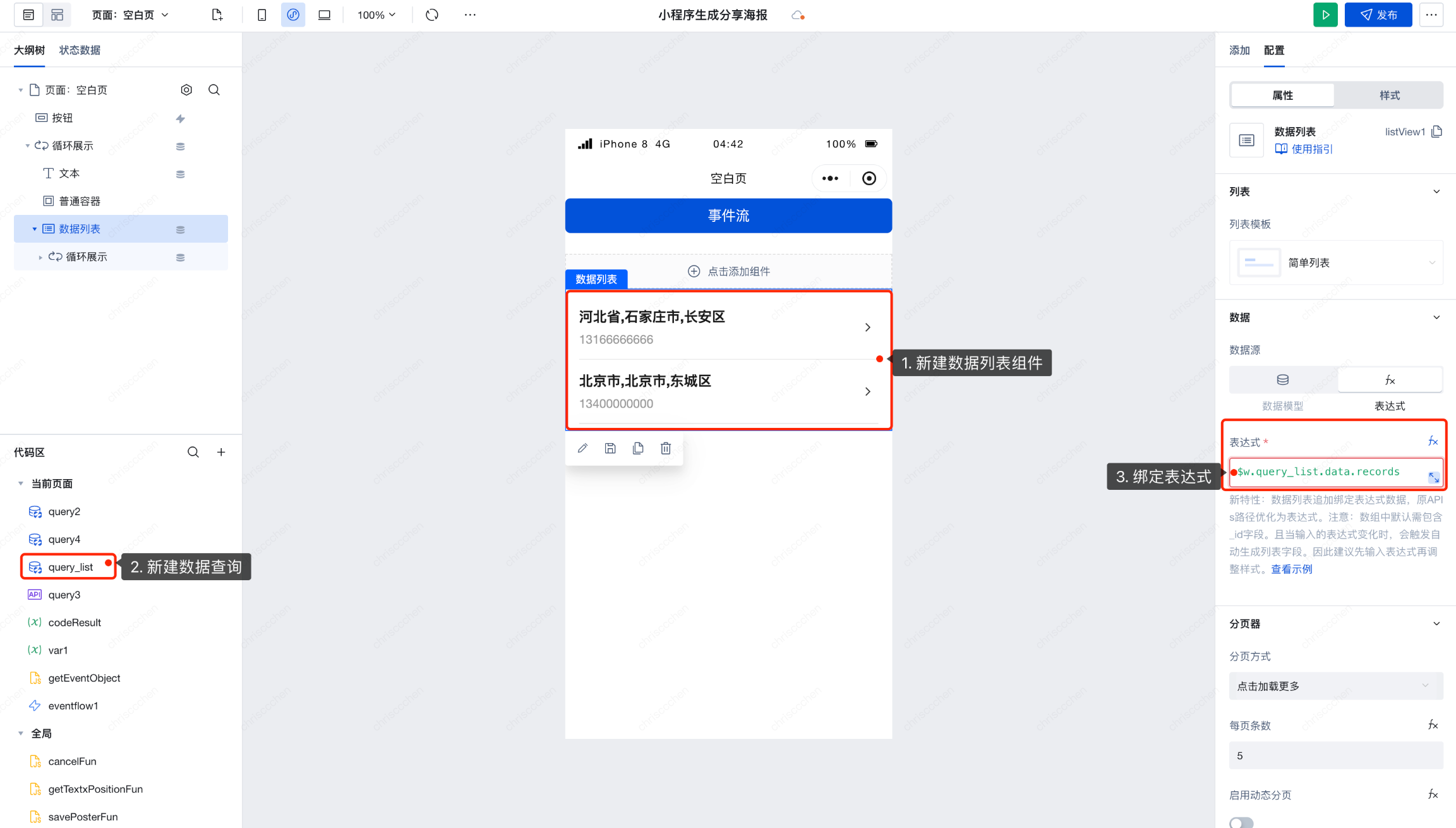 7. 完成自定义变量和 Query 新建之后,开始进行组件的配置。这里我们为了达到更好的列表展示效果,可以把前面的循环展示组件,换成数据列表组件,数据列表与循环展示组件的数据绑定流程类似,在数据列表的数据源中选择表达式,然后绑定第1步中新建的