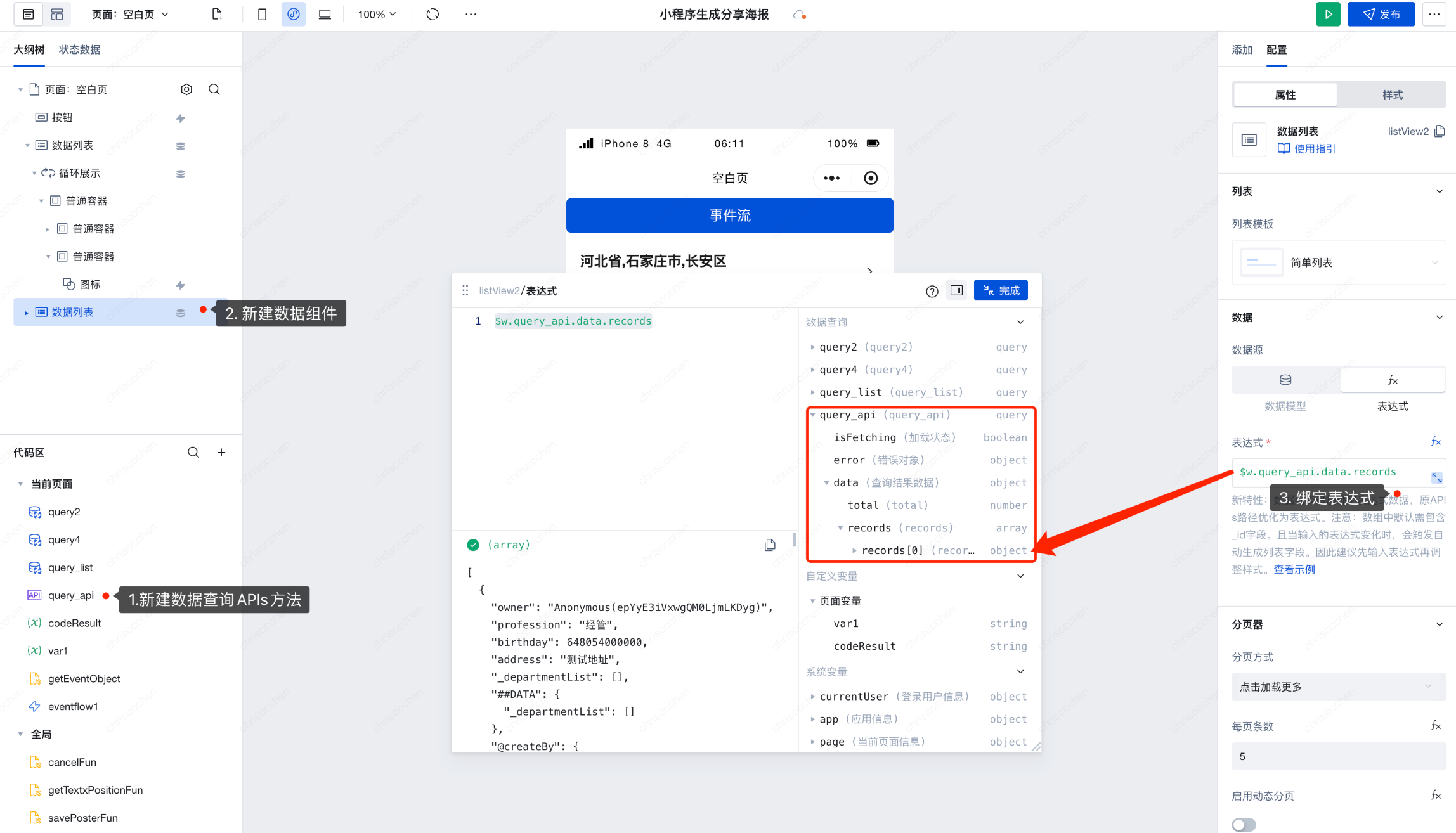 query_api 绑定和渲染列表数据了。如下图,我们可以往编辑区拖入多个所需要组件,并且分别对组件属性进行数据绑定。说明: