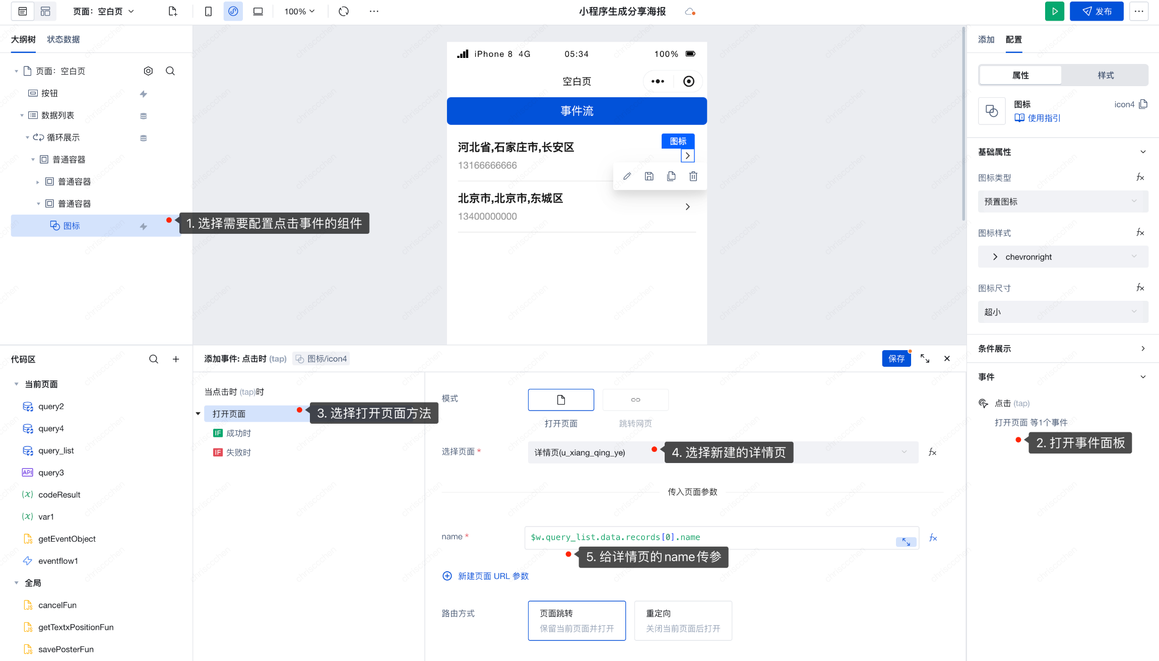 9. 配置删除按钮对应事件:选中按钮组件,在组件属性面板右下角配置对应的点击动作。