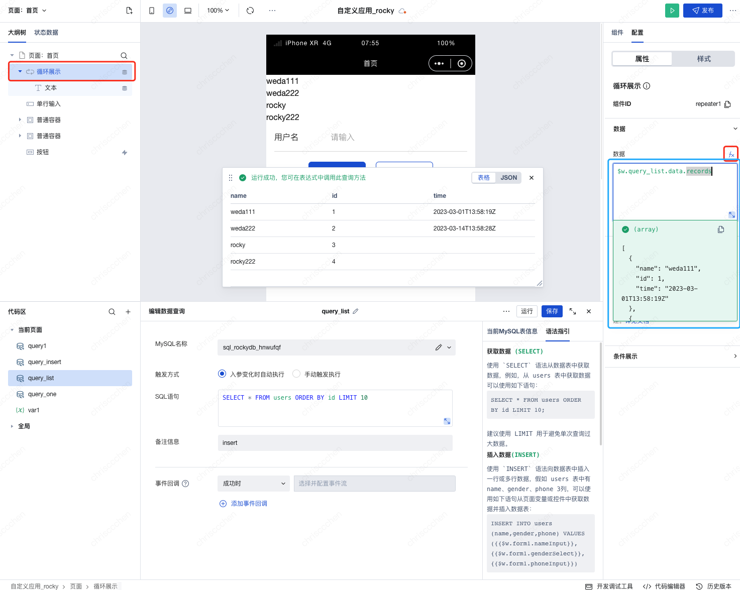 query_list.data 来对获取到的用户列表数据进行渲染展示。后续的数据绑定步骤配置与上一个示例的流程大致相同。如下图,我们可以往编辑区拖入多个所需要组件,并且分别对组件属性进行数据绑定。说明: