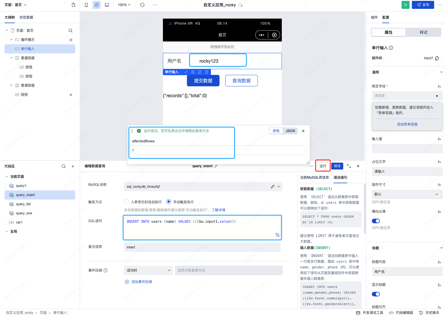 query_insert 配置中编写 SQL 语句,例如输入:INSERT INTO users (name) VALUES ({{$w.input1.value}}),表示将输入框的值作为一条新数据,插入到 MySQL 数据库的 users 表中的 name 字段,单击运行,即可在弹层查看 Query 的执行结果(执行成功则表示数据完成了插入,由于插入的是测试数据,请注意脏数据的处理),如下图所示。