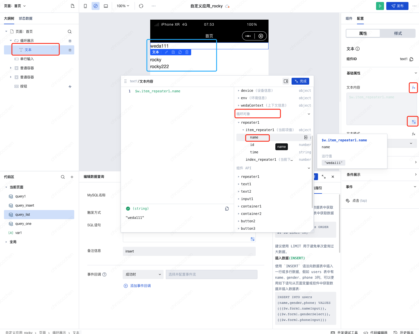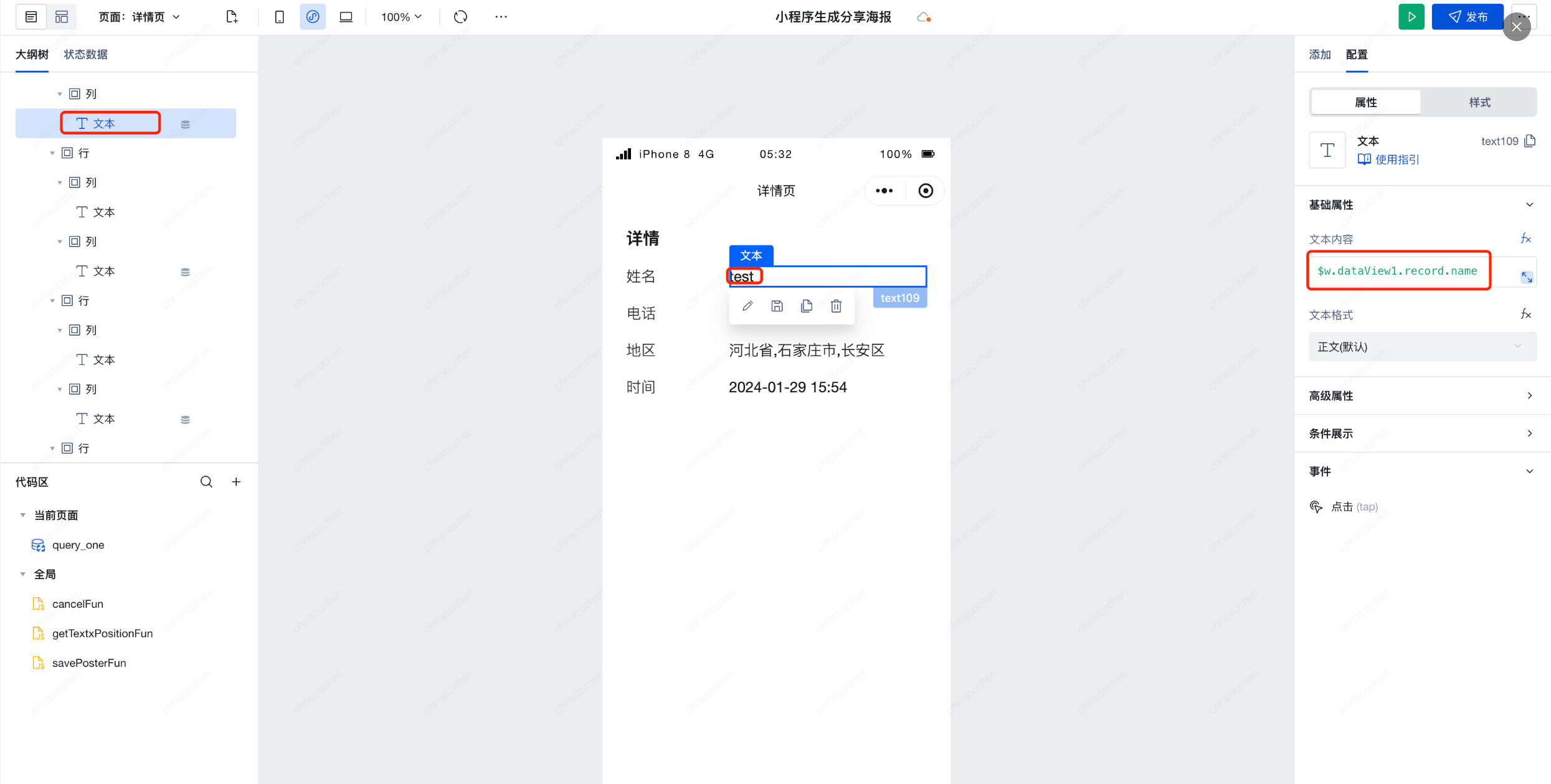 4. 再对循环组件内的其他文本组件进行字段绑定,参见配置如下: