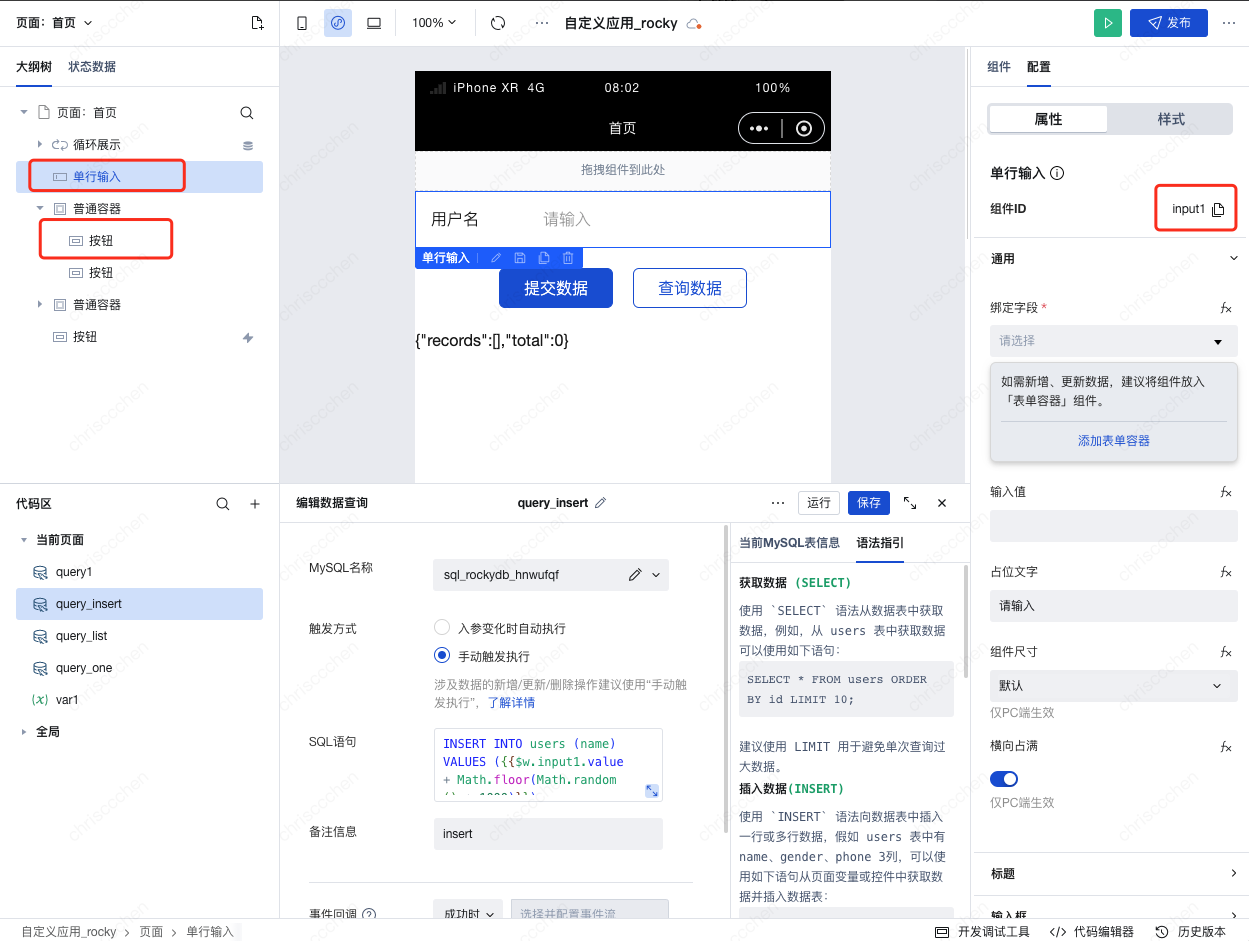{{ }} 进行包裹,如:{{$w.input1.value}},例如需要根据单行输入组件 input1 的输入值进行用户信息的查询,SQL 语句可以写作:SELECT * FROM users WHERE users.name={{$w.input1.value}},再例如使用 SQL 进行模糊查询:SELECT * FROM users WHERE users.name like {{"%" + $w.input1.value + "%"}}。注意: