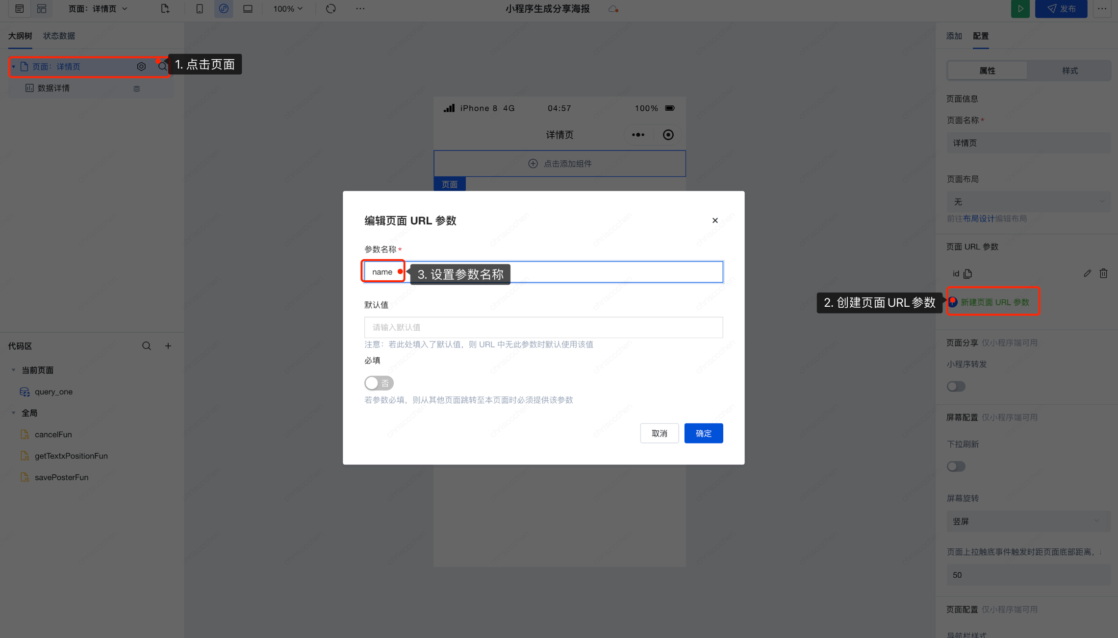 1. 在新建 Query 之前,先新建一个内容详情页页面,并且给这个页面配置一个 URL 参数变量,参考配置如下: