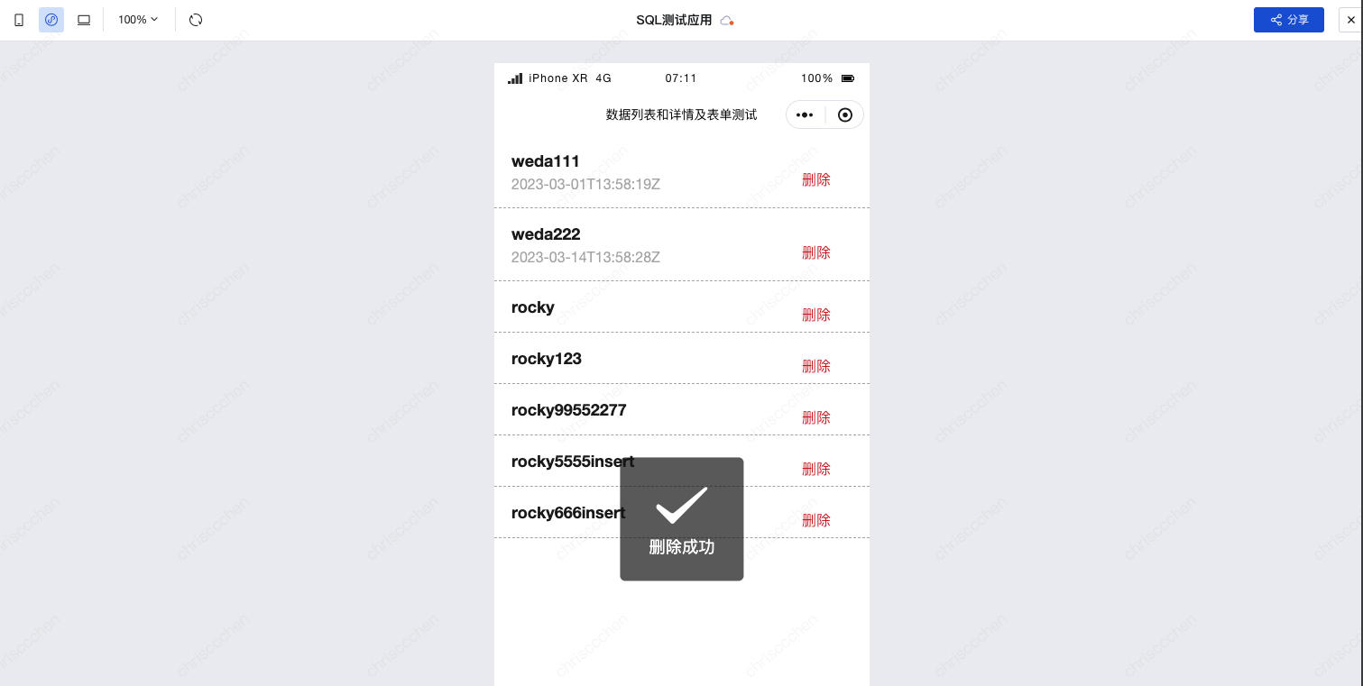 10. 完成上述配置后,可通过单击编辑器右上角预览按钮,打开预览界面来进行操作和查看效果。如下所示,单击页面上的删除,即可删除对应的行数据,同时完成删除后的数据列表也会同步刷新。