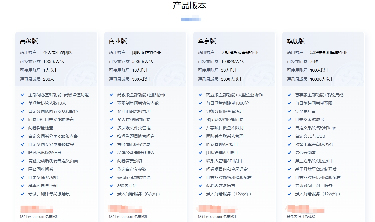 腾讯问卷根据不同用户的使用需要,推出了差异化的功能和服务,提供免费版、高级版、商业版、尊享版、旗舰版供用户灵活选择,用户可以根据自身使用场景和需求使用。