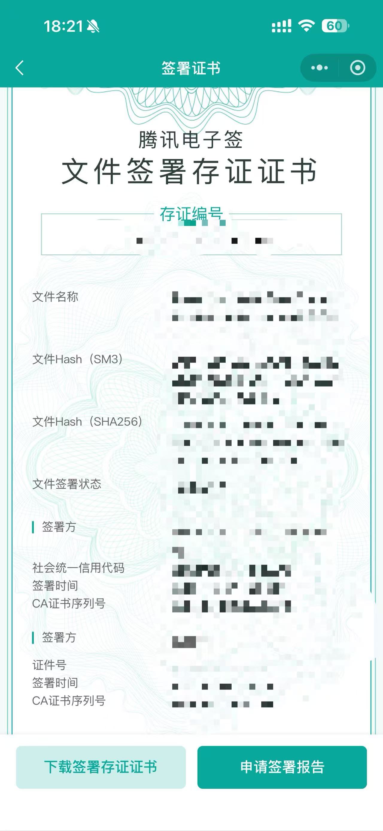 查看文件签署存证证书:支持查看签署完成合同的文件签署存证证书,并支持下载保存到本地。