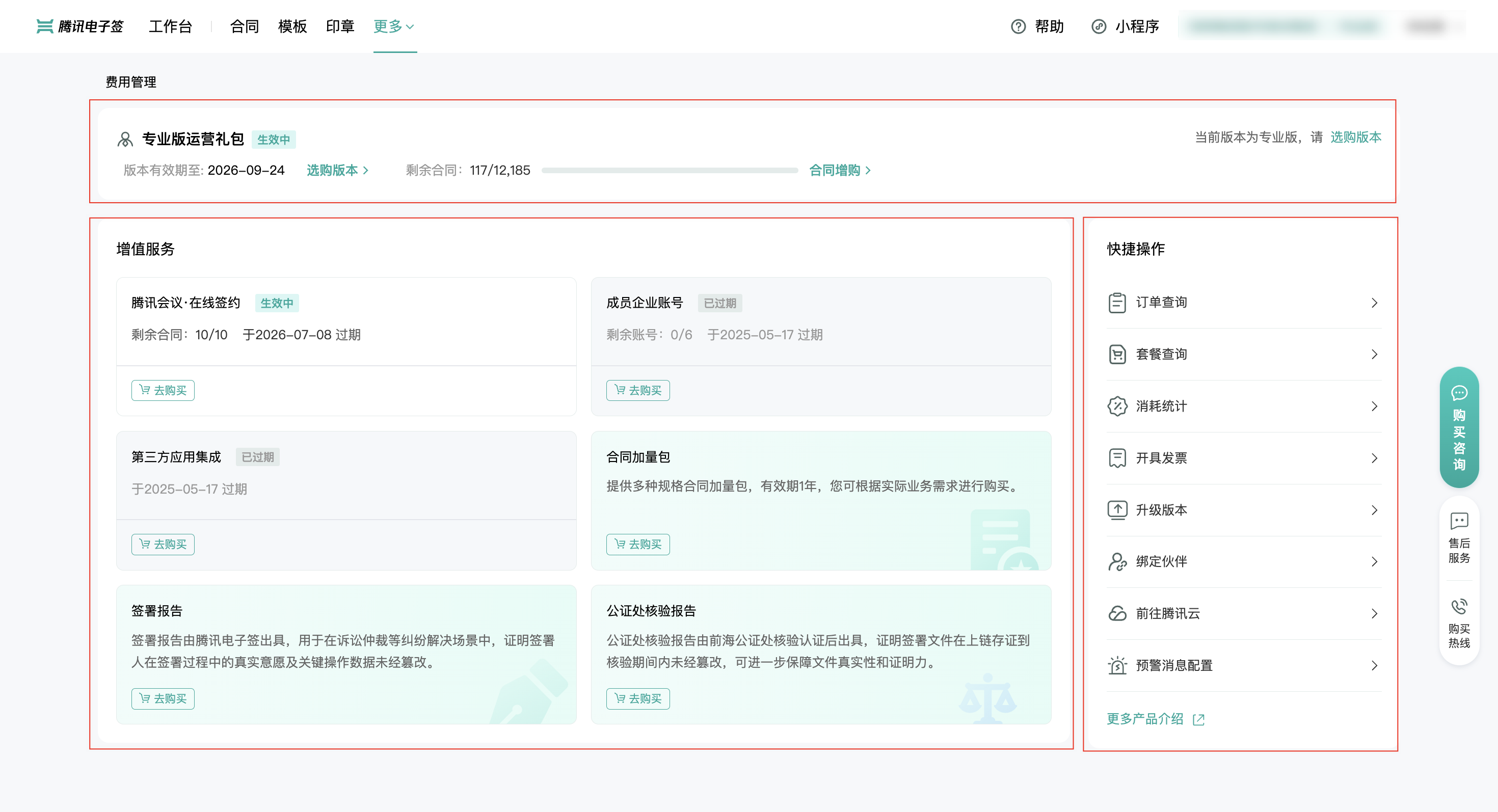 增值服务展示区:可以购买合同加量包、签署报告、腾讯会议·在线签约等增值服务。单击去购买,可以跳转到购买页进行购买。具体购买流程请参见 购买指南。