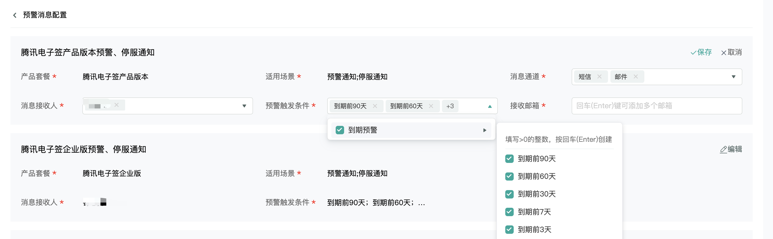 预警触发条件 | 到期预警:可以选择或者自行输入到期提醒的提前天数。 余量预警-百分比:可以选择或者自行输入余量预警的百分比。 余量预警-数量:可以选择或者自行输入余量预警的数量。 注意: 产品版本&第三方应用集成产品仅可配置到期预警,没有数量维度。 |