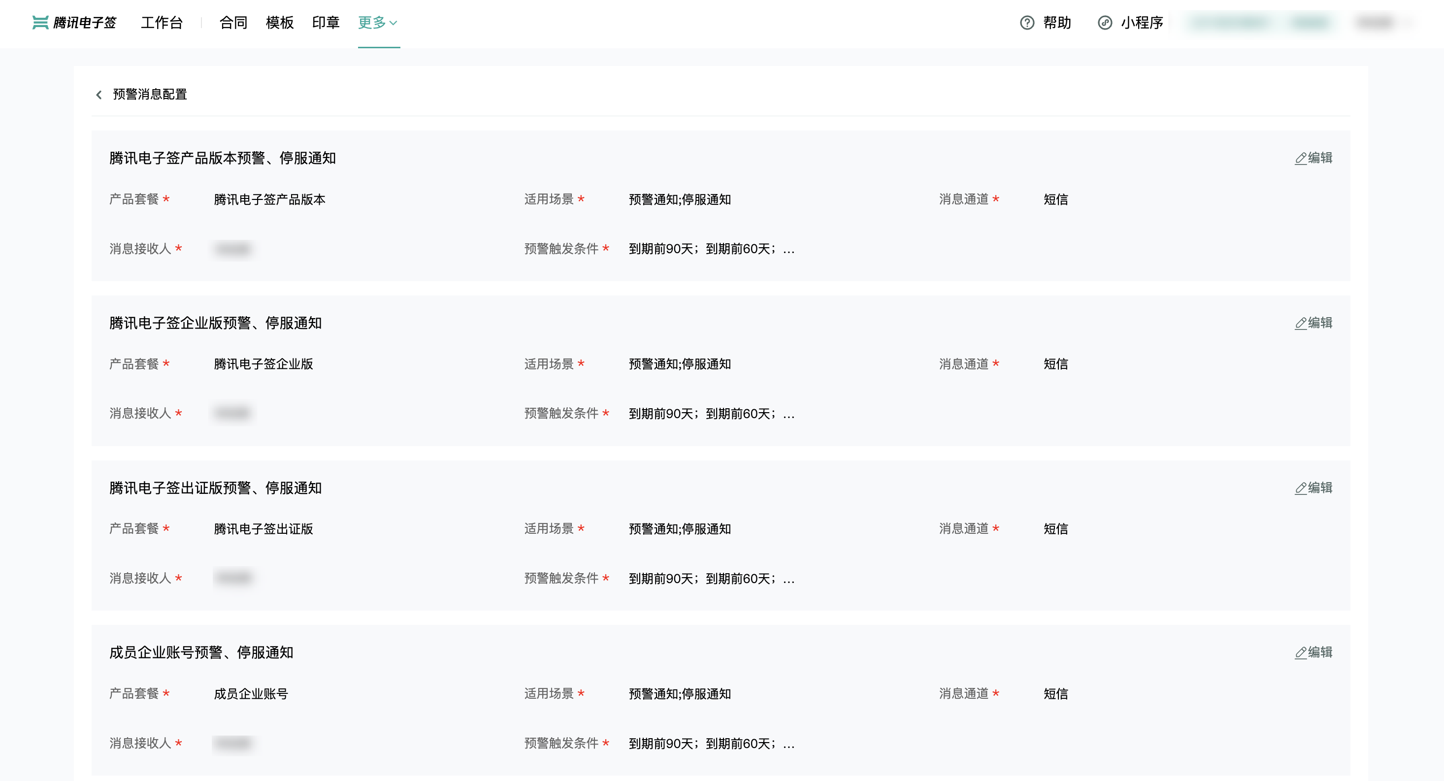 步骤1:进入配置页面后,会自动展示企业下所有的产品类型,并有默认的预警、停服通知的策略。