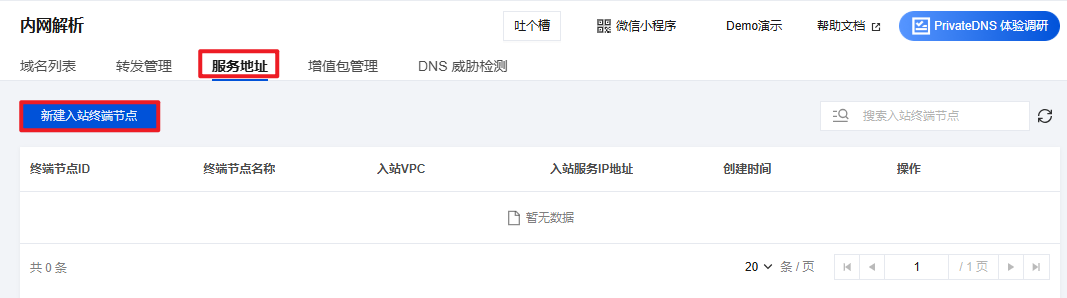 1. 登录私有域解析 Private DNS > 内网解析 > 服务地址 页面,单击新建入站终端节点。