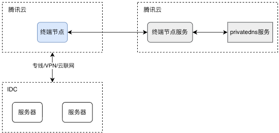 在混合云架构中,云下环境(例如本地数据中心或其他云)的应用和服务需要访问腾讯云内(例如腾讯云 VPC)托管的内网资源。为了保证能够正确解析,云上环境的 Private DNS 支持配置入站终端节点,通过入站终端节点进来的域名请求将自动转发到云上的 Private DNS 服务器进行解析。这样,云下应用发起的 DNS 查询请求将转发至云上 DNS 处理,实现跨云环境的内网域名解析和访问。