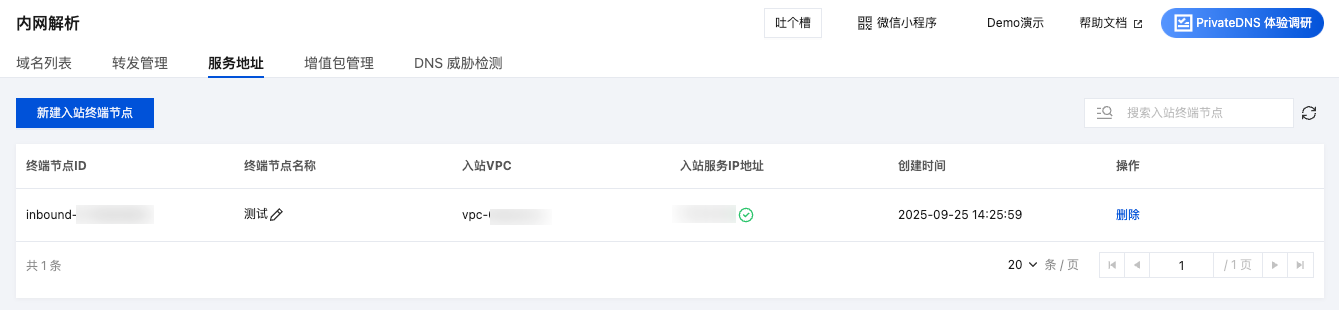 3. 完成入站终端节点配置后,单击确定,即可创建成功。已创建的节点会自动展示在服务地址列表中。