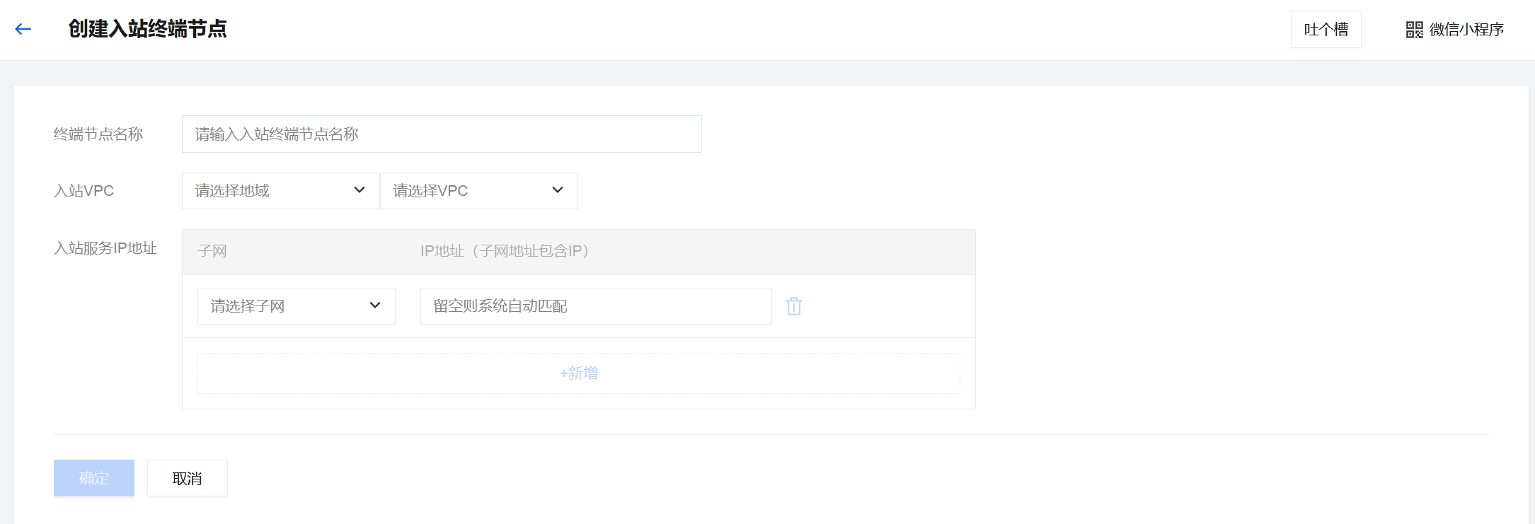 2. 在创建入站终端节点页面,配置终端节点名称、入站 VPC、入站服务 IP 地址。