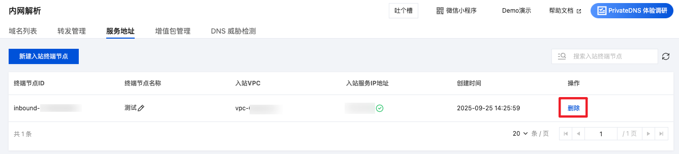 如果您不需要某个服务地址,可在服务地址页面中,找到需要删除的入站终端节点,单击删除。