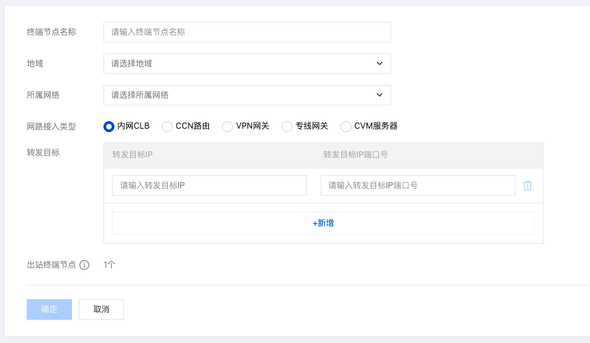4. 在创建终端节点页面,配置终端节点名称、地域、所属网络、网络接入类型、转发目标、出站终端节点。