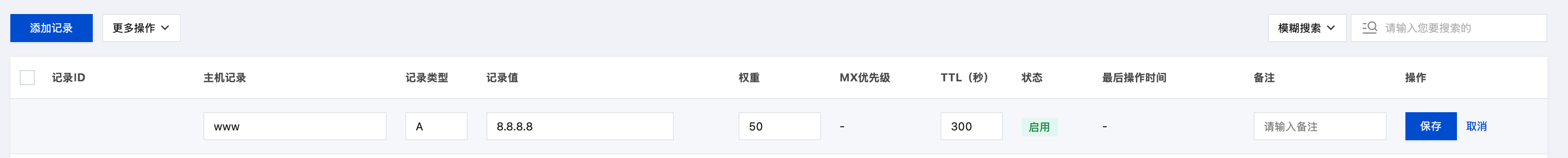 2. 在解析记录页签中,单击添加记录并填写相关记录值信息。如下图所示: