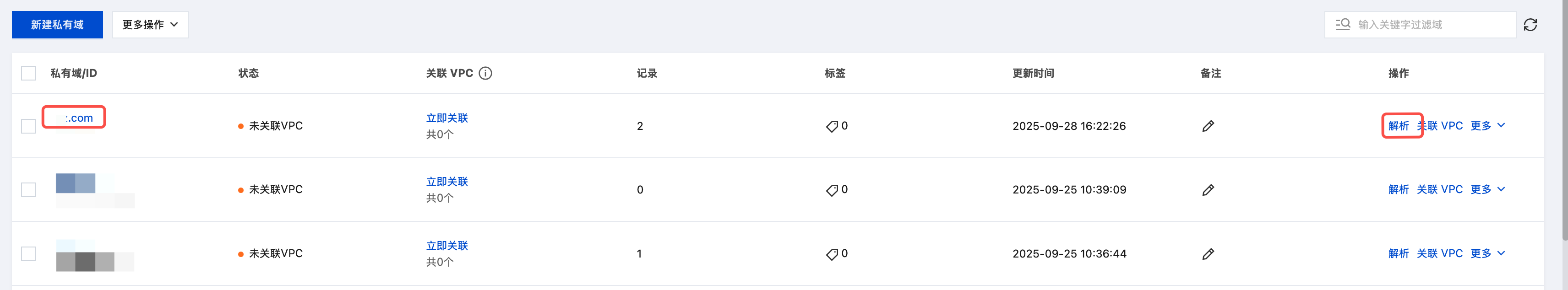 1. 登录 腾讯云 DNSPod 控制台 > 内网解析 页面,在域名列表页签中,单击您需要创建 A 记录的私有域名称或解析。如下图所示: