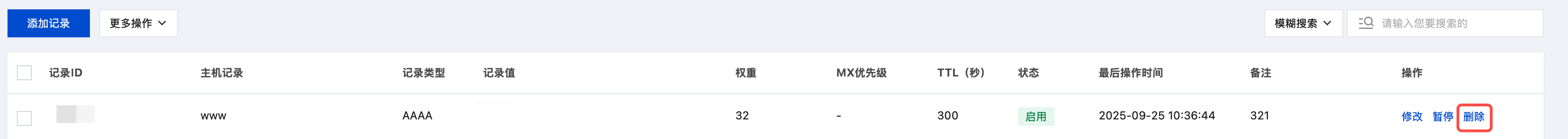 若您不需要某条解析记录时,可进行删除操作,删除后该记录将不生效,请谨慎操作。
