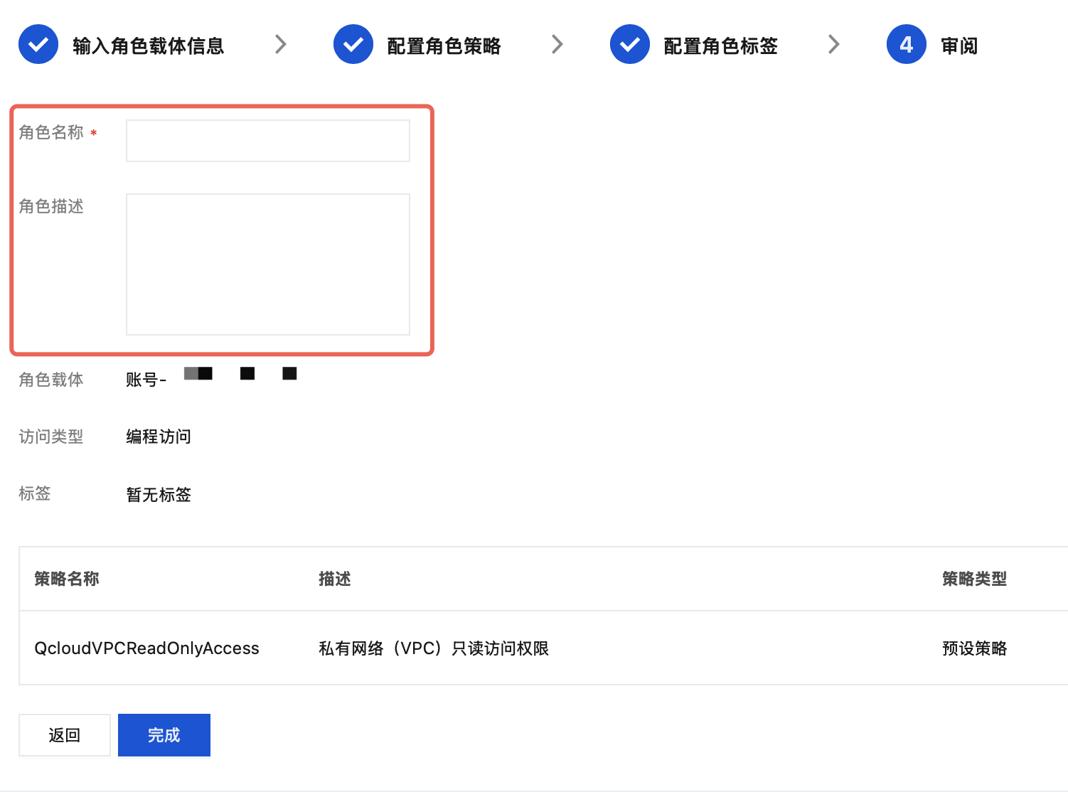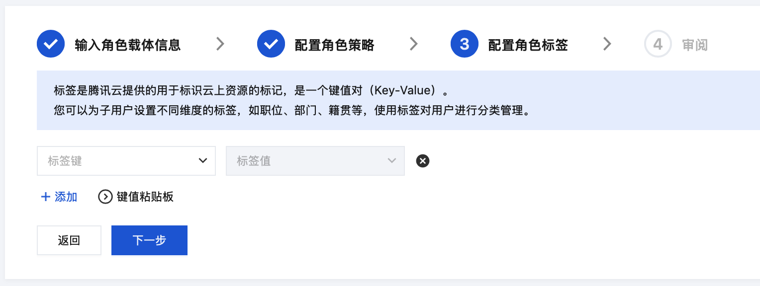5. 进入配置角色标签步骤,可以根据需要为子用户设置不同维度标签,设置完成后单击下一步: