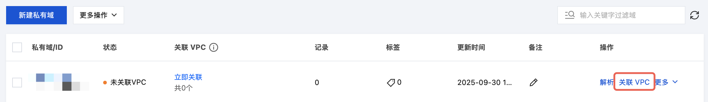 2. 在内网解析页面,选择需要授权的私有域,单击关联 VPC。如下图所示:
