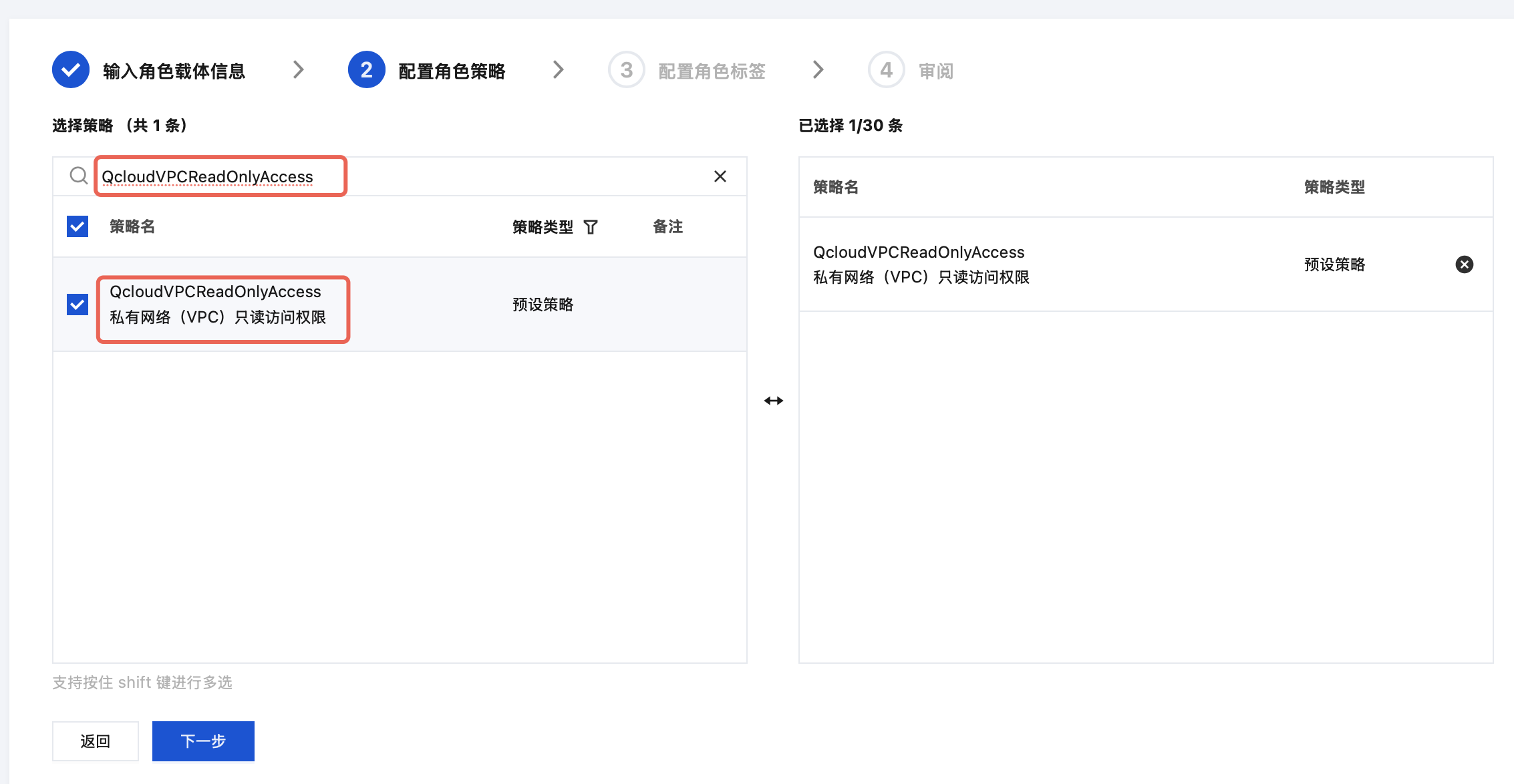 QcloudVPCReadOnlyAccess 策略,单击下一步。如下图所示:
