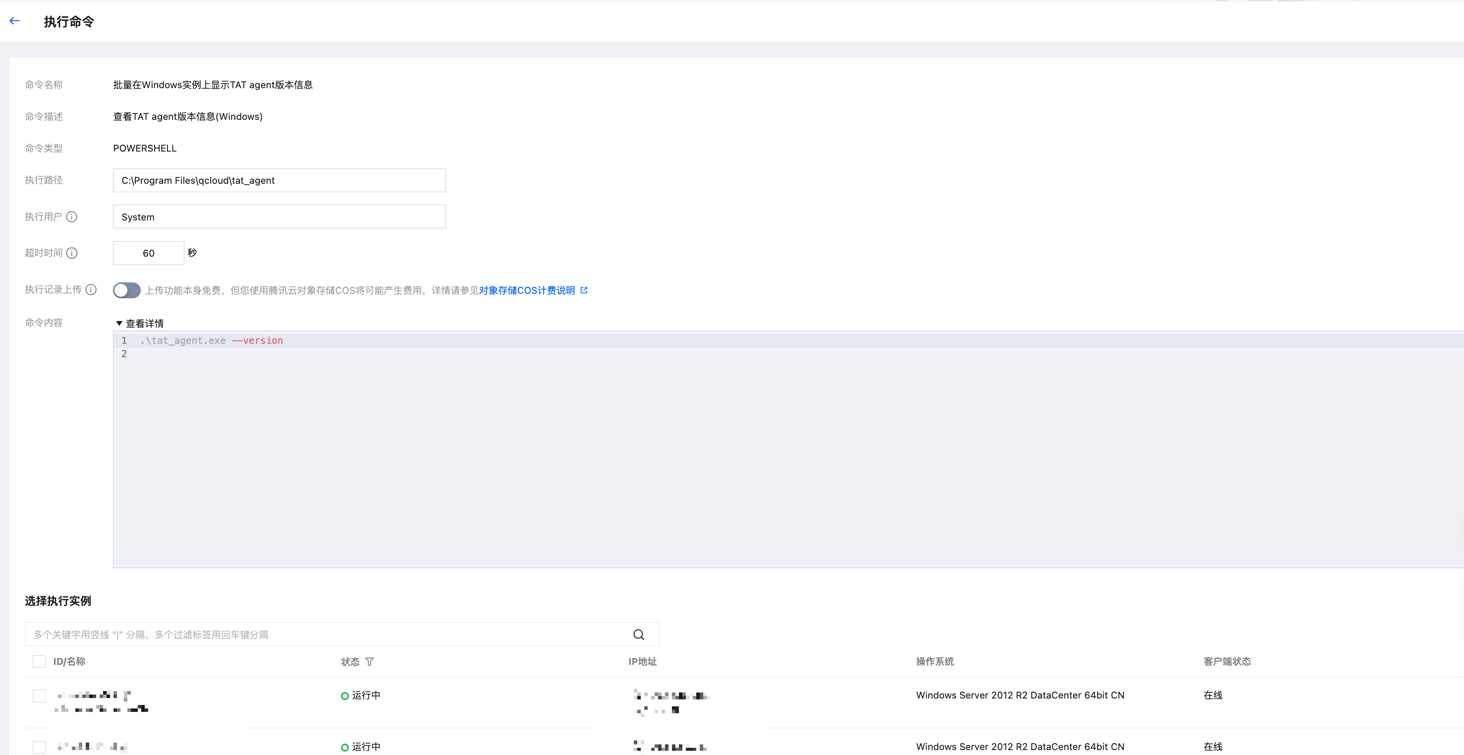 超时时间 | 设置命令在实例中的超时时间,当执行命令的任务超时后,自动化助手将强制终止任务进程。单位为秒,默认为60秒,取值范围为[1, 86400]。 |