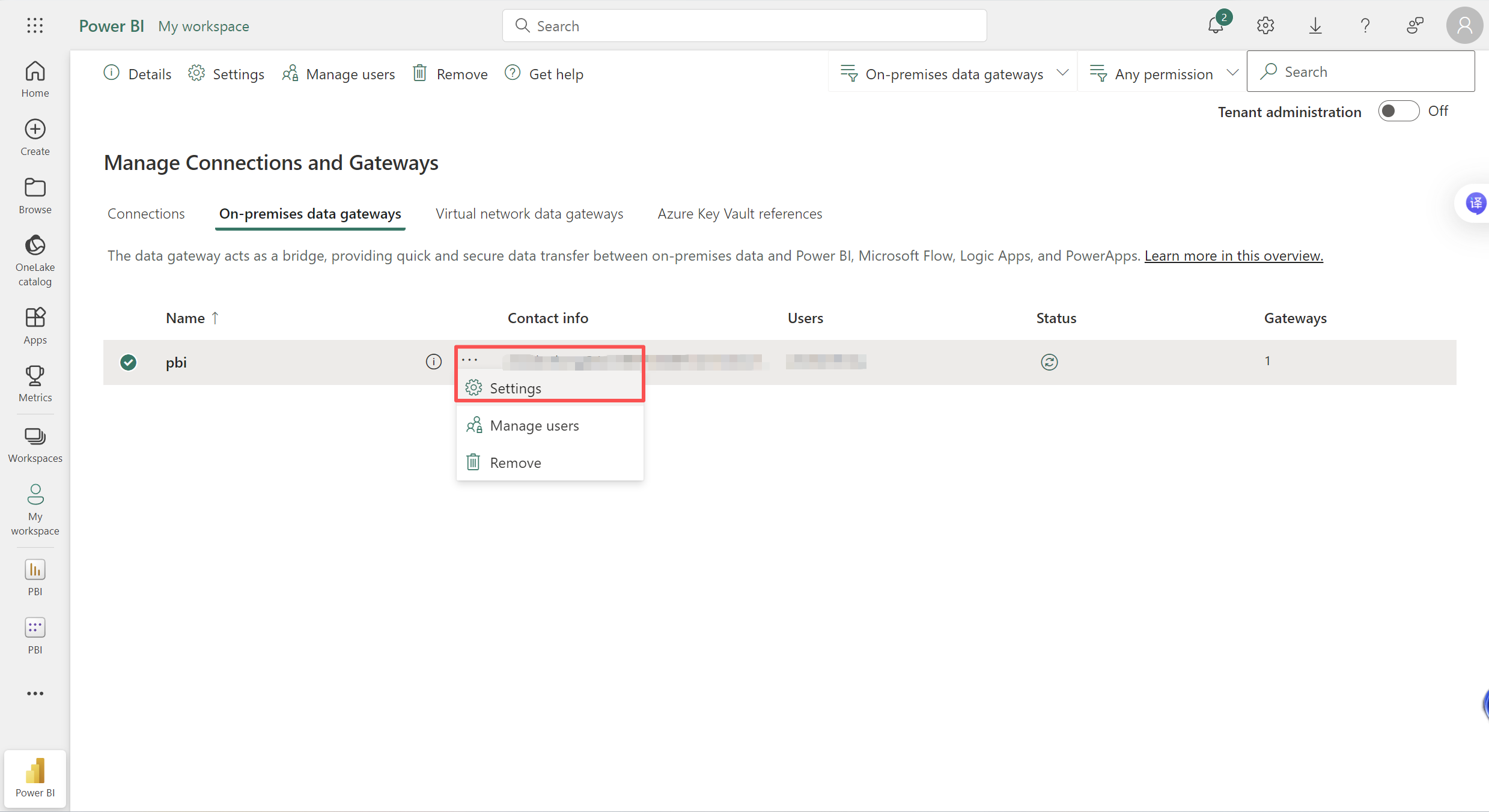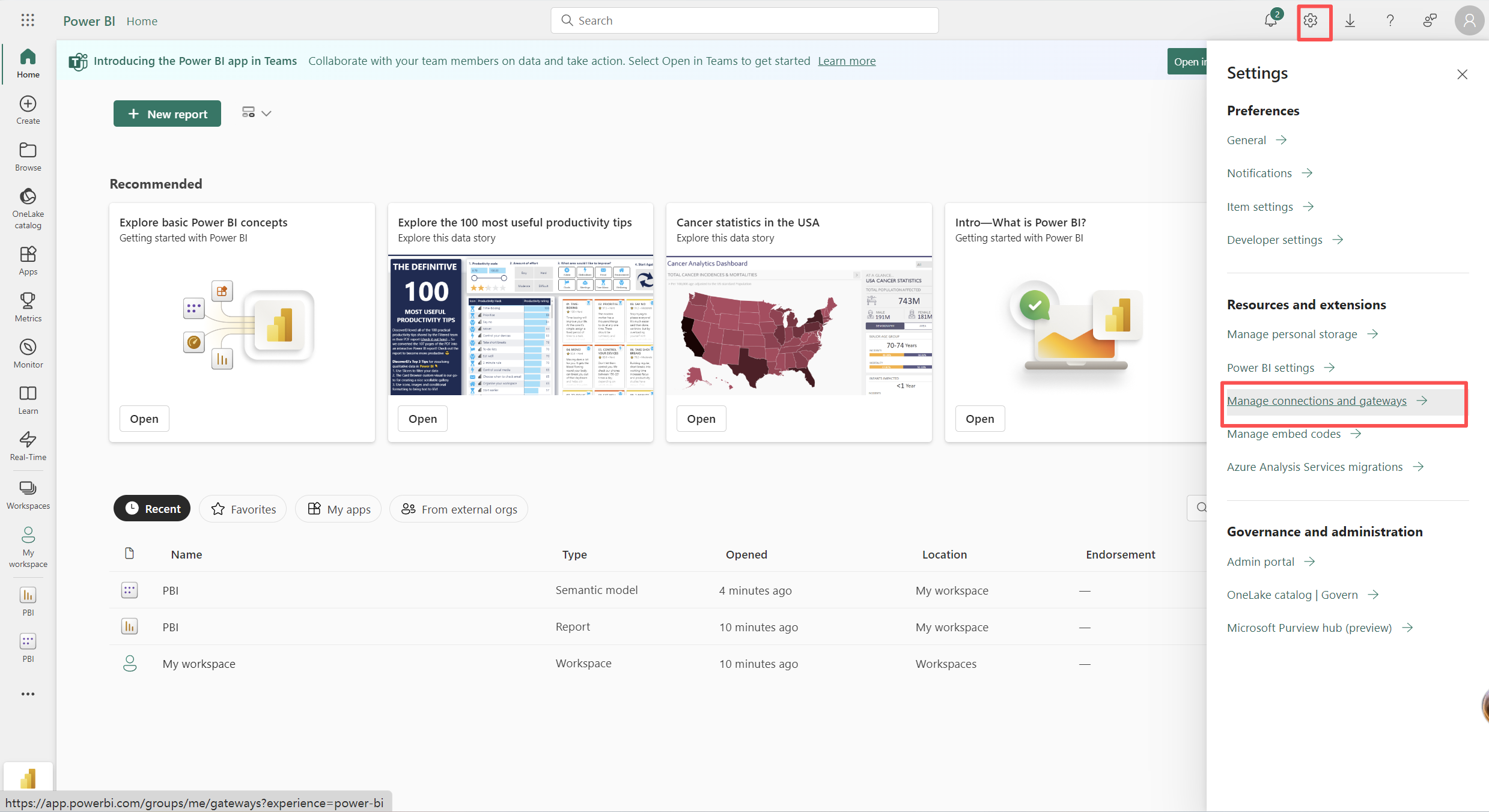 2. 点击右上角齿轮图标,选择 Manage connections and gateways (管理连接和网关)。