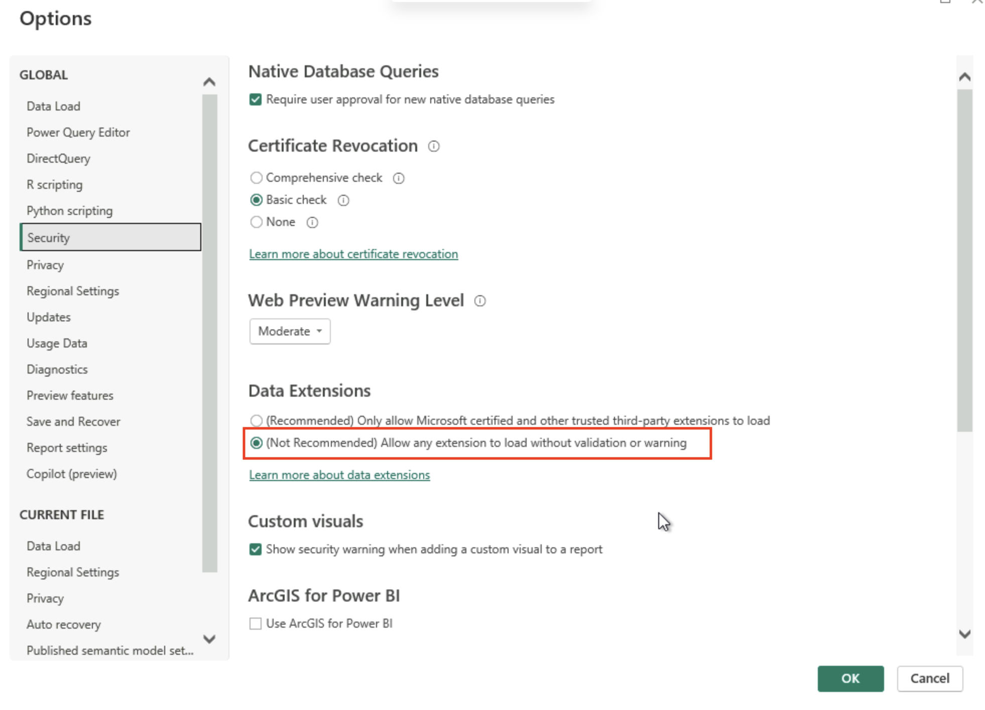 由于使用了自定义连接器,需要调整 Power BI 的安全策略: