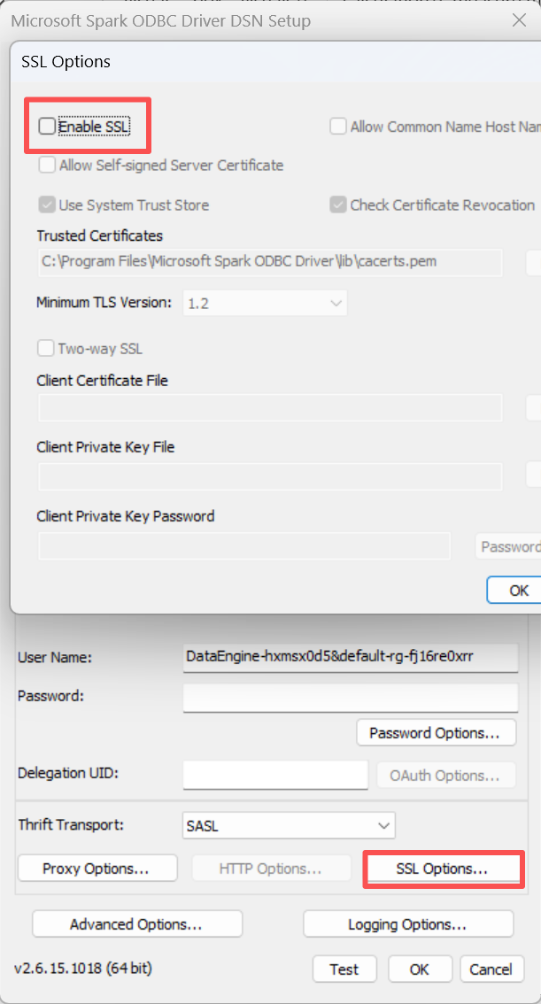 取消勾选 Enable SSL(根据 DLC 实际网络环境配置,通常内网/VPC 访问需关闭,公网可能需要开启,请以实际白名单说明为准)。