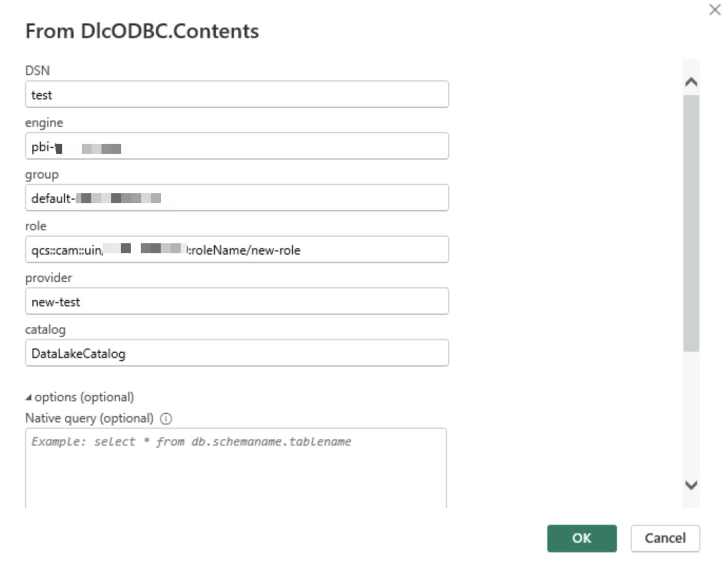 参数配置: 填写与 Desktop 端一致的 DSN、引擎名称、资源组、角色 ID 等信息。