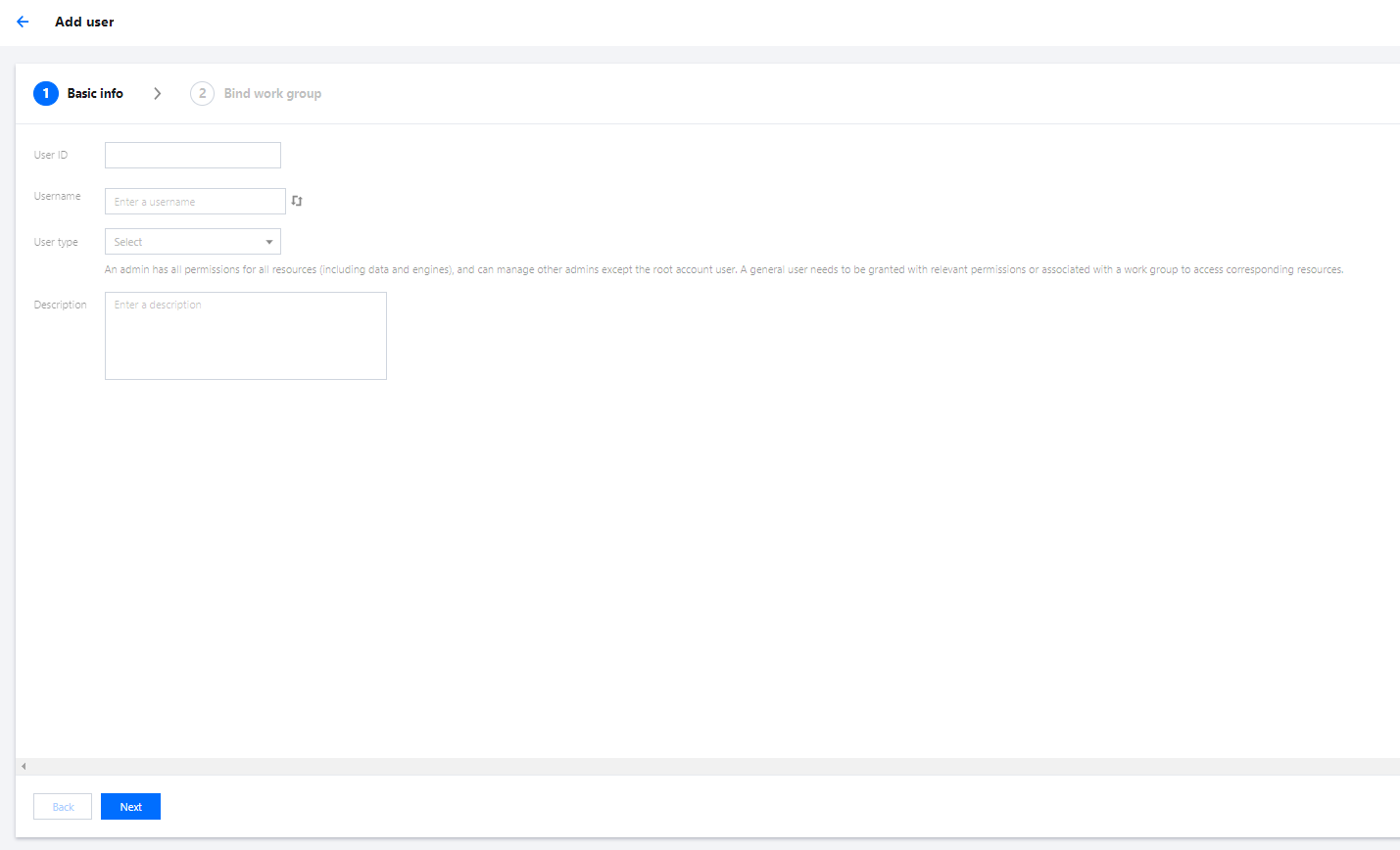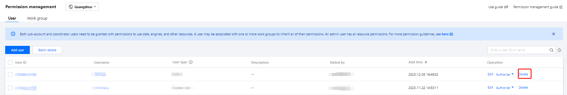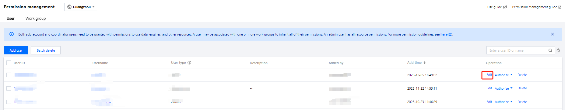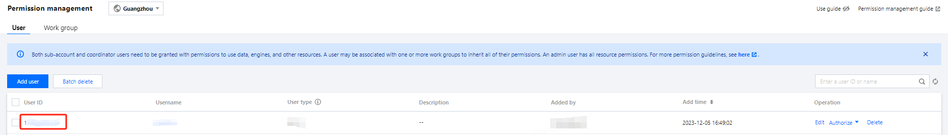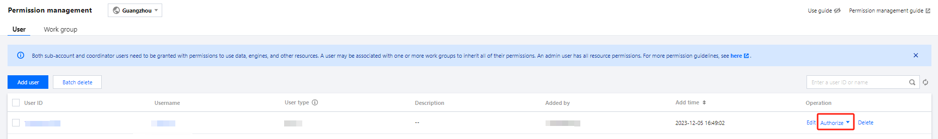 1. Set a user as an admin/general user. An admin user does not need to be associated with a workgroup to have all resources, including all permissions for data, engines, etc., and can manage admin users other than the main account. This permission needs to be set with caution.