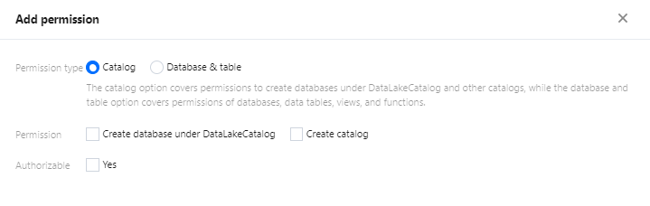 Add data directory permissions. Data directories can be set to create database permissions under DataLakeCatalog, as well as create permissions for other data directories.