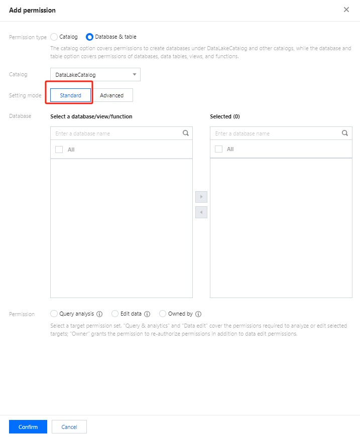 Add Database Table Permissions. Permissions can be added through two modes: Regular Settings and Advanced Settings. Regular Permission Settings: You can add permissions for database tables under a specified directory, setting query analysis, data editing, and owner permissions.