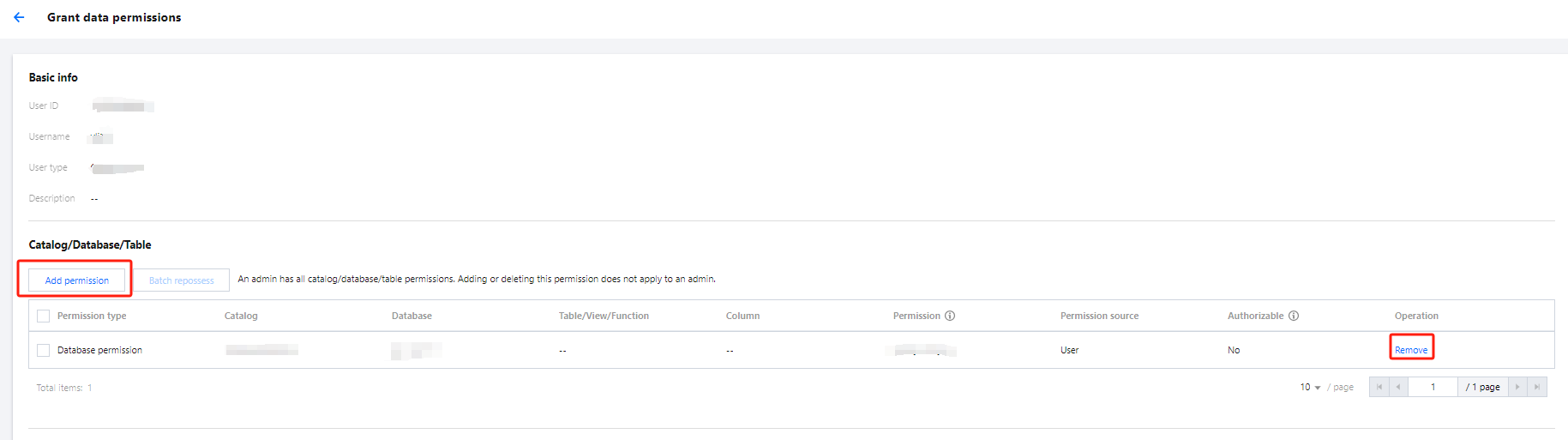 Enter the authorization interface (taking data permissions as an example), modify permissions by adding or removing them (the same operation applies to the modification of engine permissions).