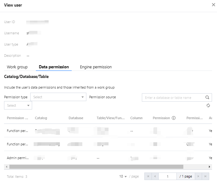 2. View information such as the workgroup a user belongs to, data permissions, engine permissions, etc.
