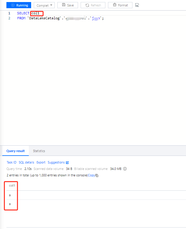 After clicking Confirm to complete the addition, execute a query in the data exploration module, input the following SQL statement to preview the information of "col1", and you can view the preview results of this column after running.