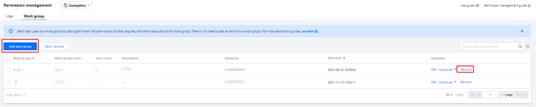 Adding or removing workgroups requires administrative action, similar to user data permission operations. Users within a group possess all the permissions that the group has. By binding a batch of users to a workgroup and granting the group data, engine, and other resource permissions, user permissions can be managed in bulk. Administrators do not need to be bound to a workgroup.