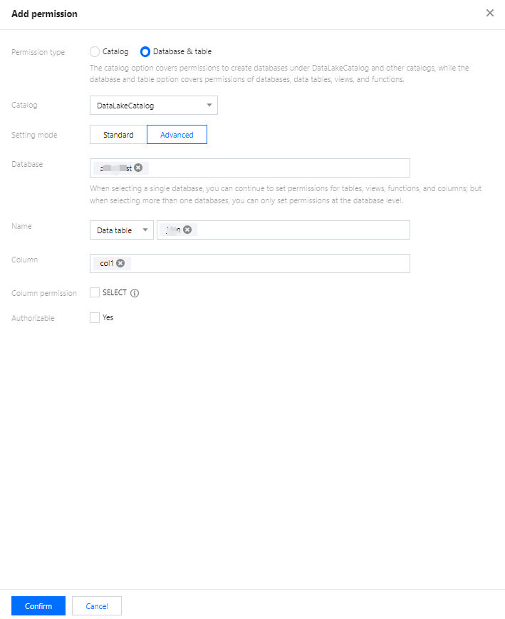In advanced mode, column-level permission settings are supported. When selecting a single data table, query permissions for columns can be added. You can authorize either one/multiple columns or all columns.