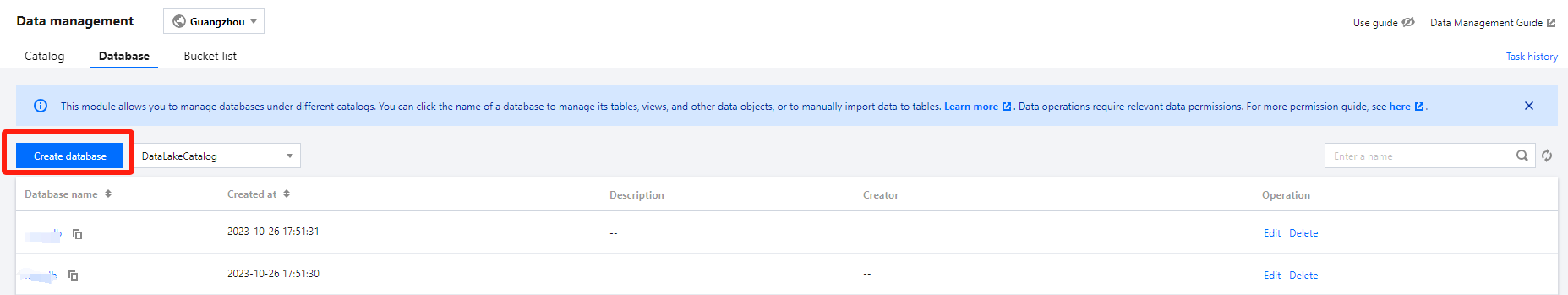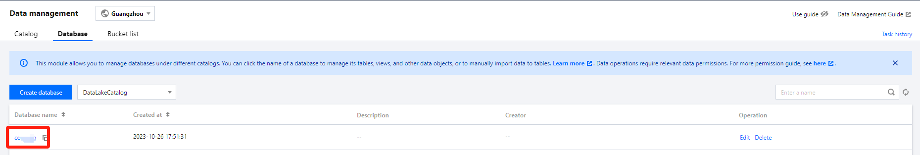 The platform will automatically create a DataLakeCatalog for you to manage your lake data.