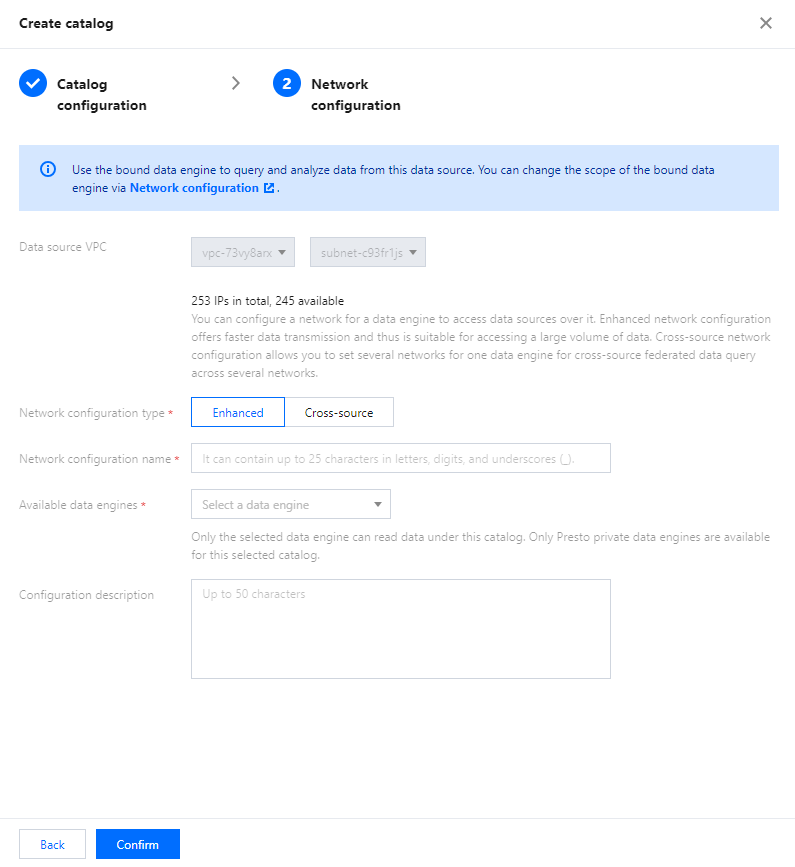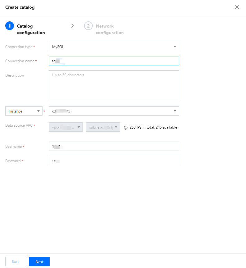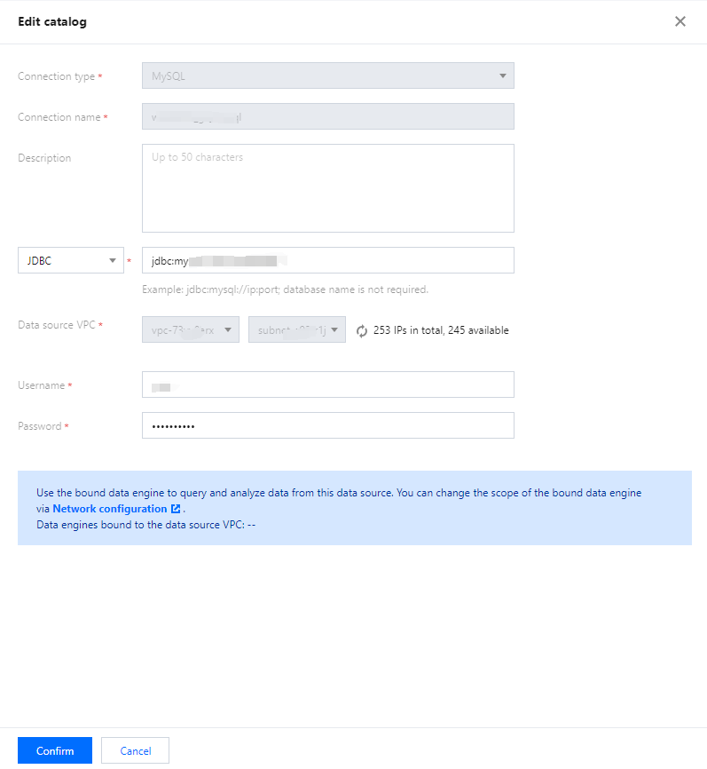 1. Click Data Catalog List > Operation > Edit to modify the description, network configuration, username, password, and running cluster of the data catalog.