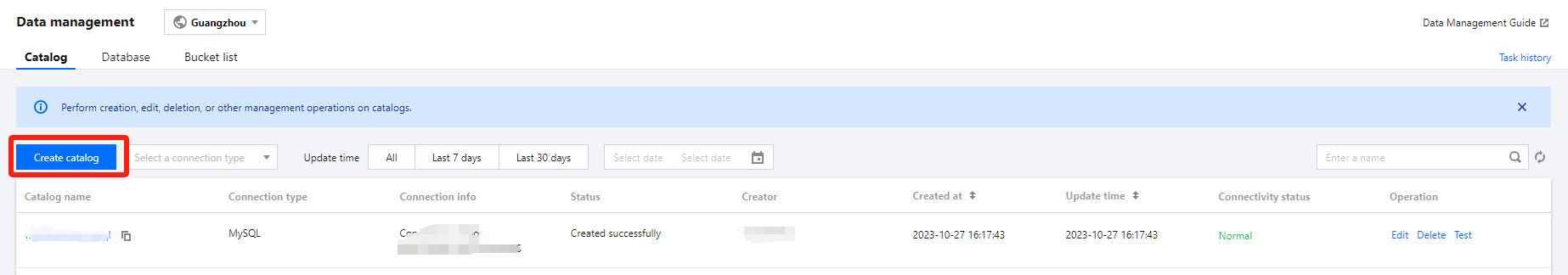 5. In the catalog list, you can view connection information, status, creator, and other details.