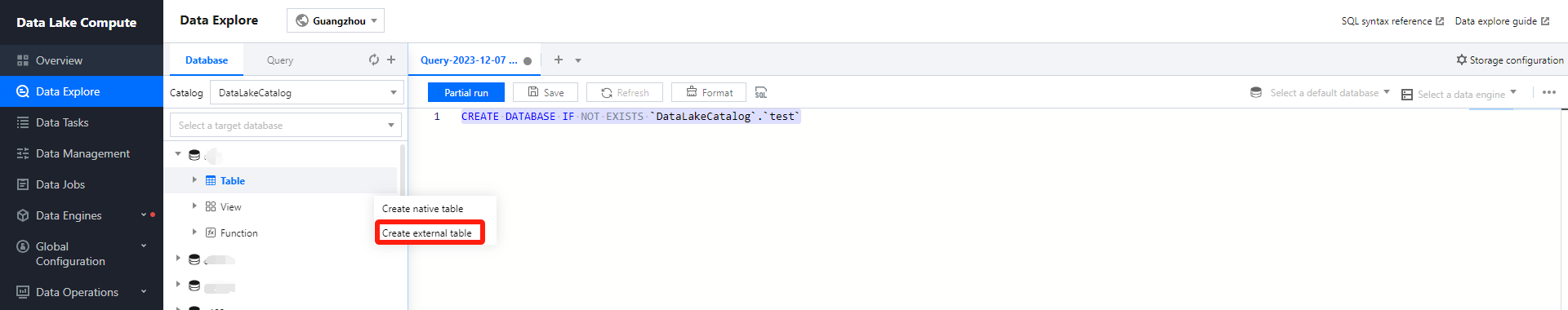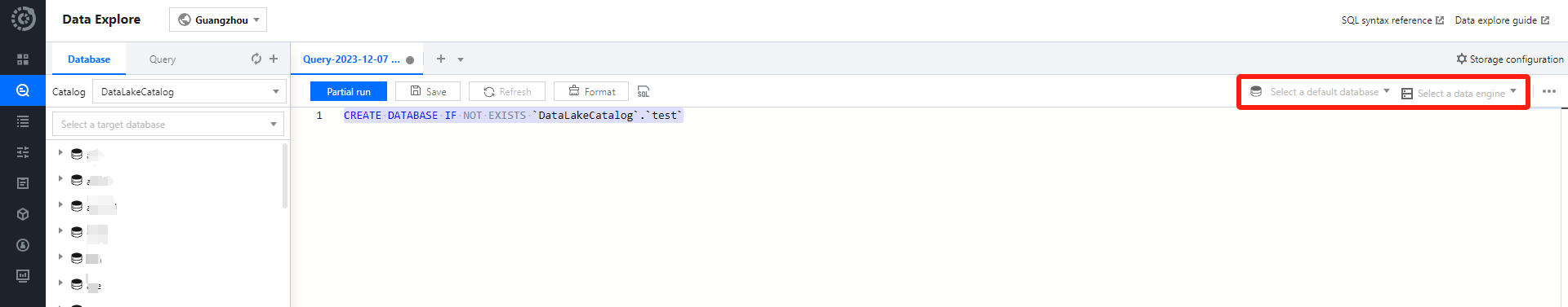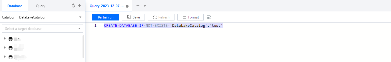 4. After selecting the execution engine in the upper right corner, execute the generated 'create database' statement to complete the database creation.