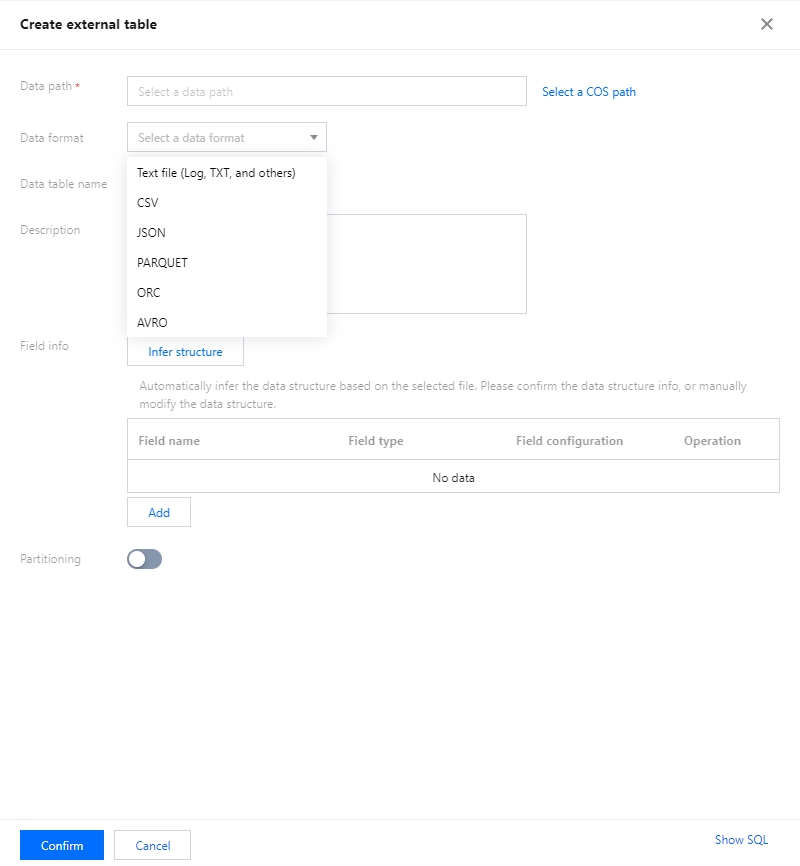 External tables typically refer to data files stored in your own COS bucket. Data Lake Compute can directly create external tables for analysis without the need for additional data loading. Given the characteristics of external tables, actions such as executing 'drop table' will not delete your original data in Data Lake Compute, but only the metadata of the table.
