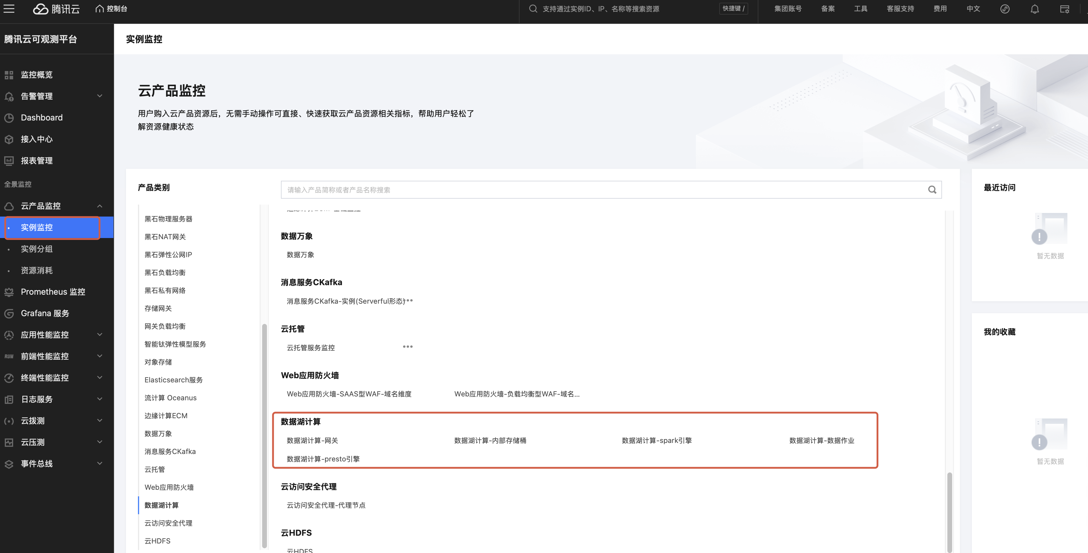 2. 左侧菜单选择云产品监控下的实例监控,找到数据湖计算 DLC,并选择需要查看监控的类型。